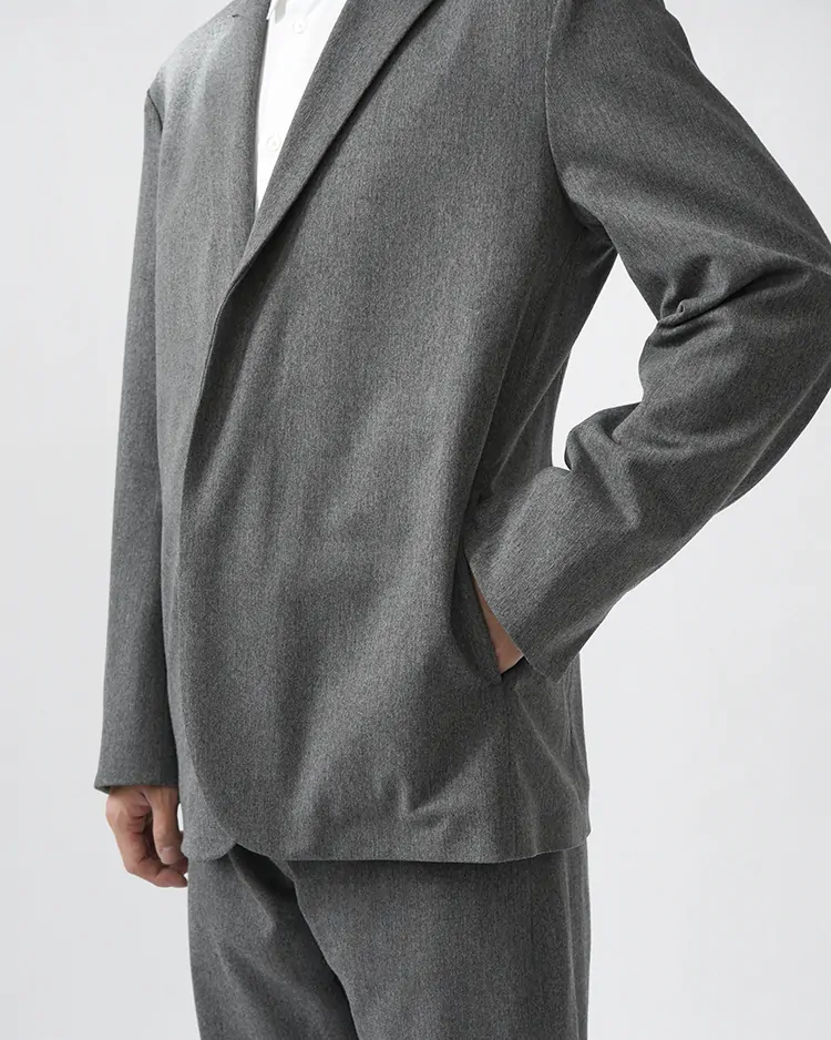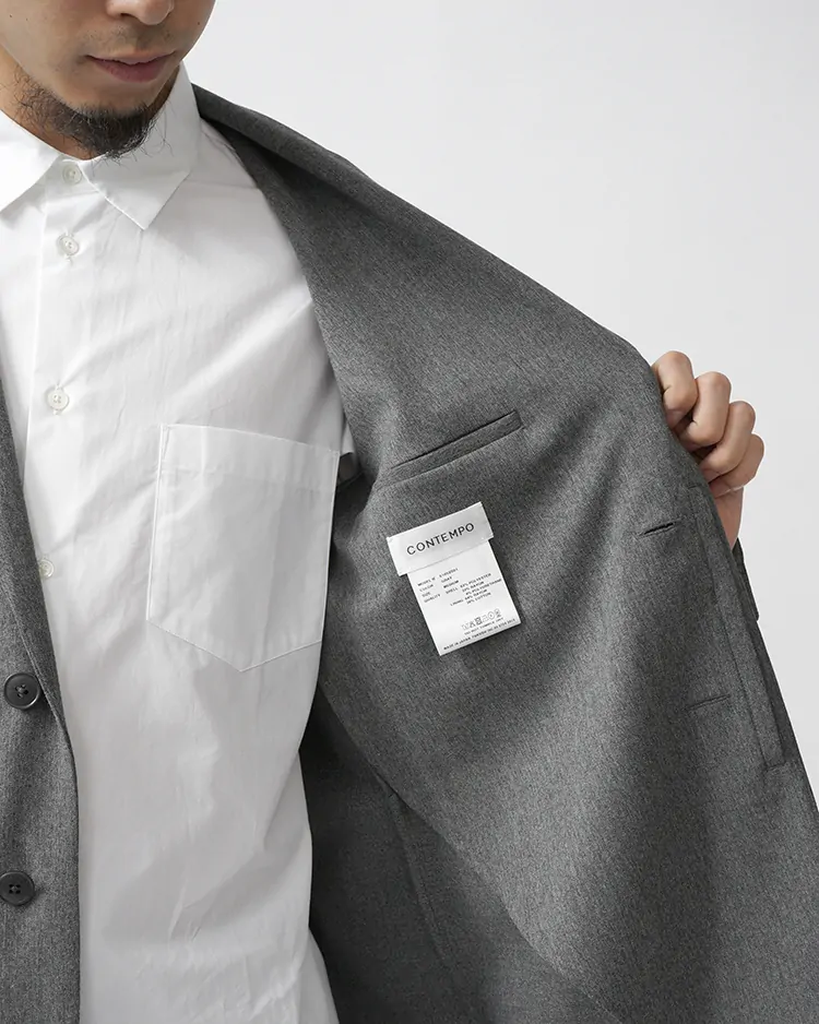 ポリエステル/レーヨン/ポリウレタンを混紡したストレッチ生地を使用しました。快適な着心地を追求し、オールシーズン着用可能なハリコシのある生地になります。