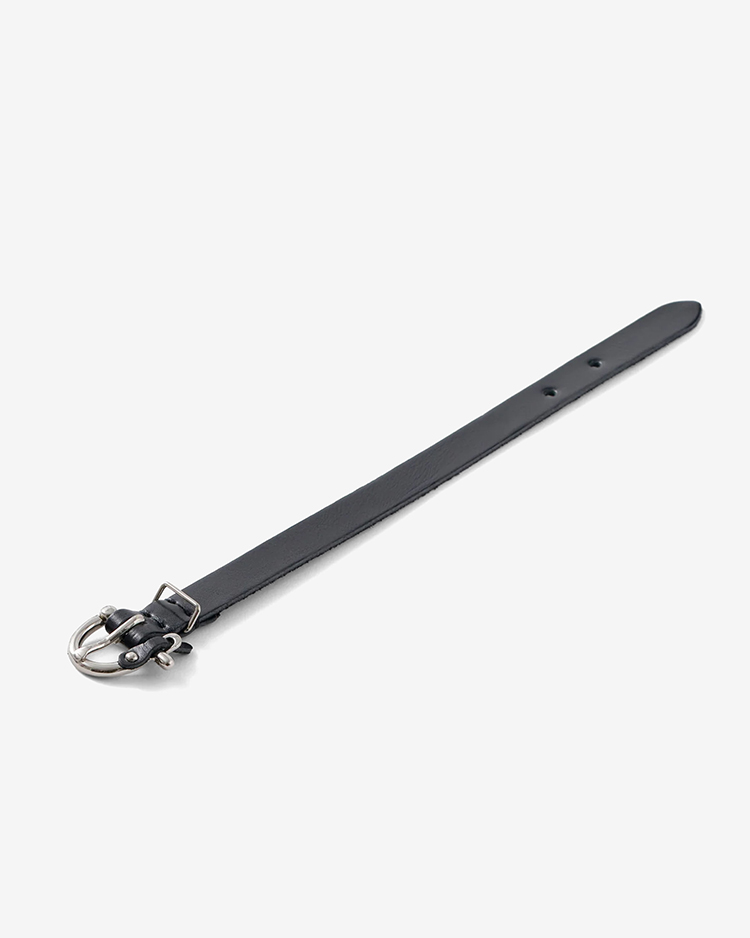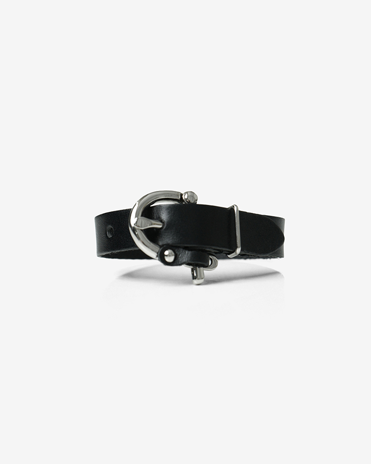 ミリタリーカラビナをモチーフに製作したオリジナルバックルを組み込んだバングルです。バックル端の穴に小さな革タブを差し込むことでロックされる仕組みで、カラビナの構造を忠実に再現しています。