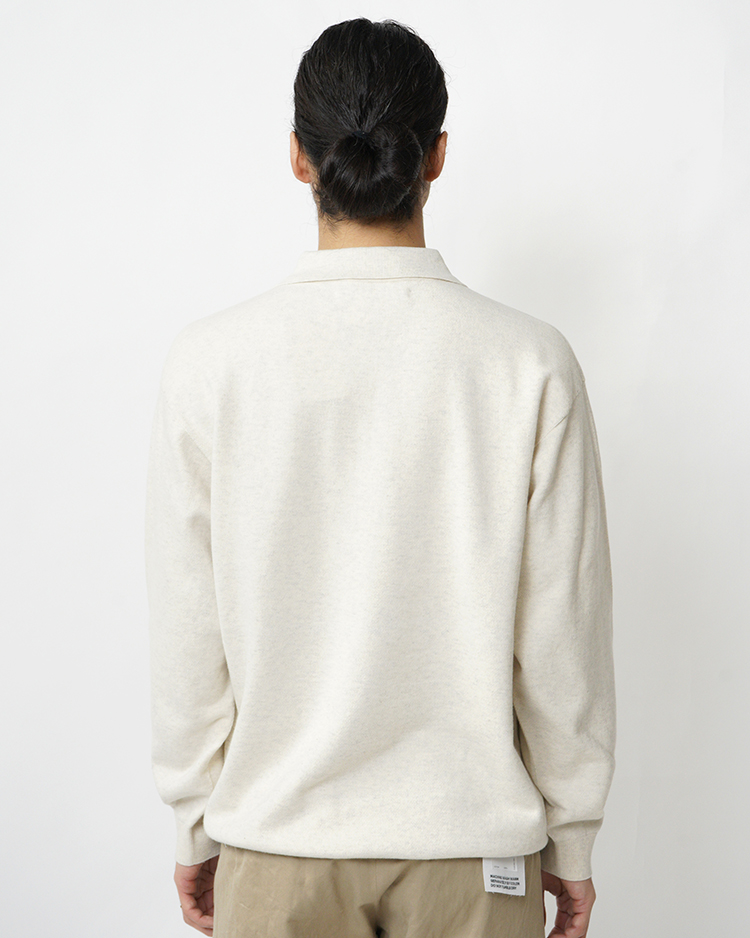 コットンにはクリンプと呼ばれる縮れがあって、その縮れがコットンの保温性を作っています。糸をつくる過程で失われてしまうことも多いのですが、綿が本来持っているあたたかさを保てるように、熟成された綿を使っています。ストレッチ性のあるナイロンで、その綿を包むように紡績することで、コシがありながらも、軽くて保温性のあるニットに仕上がりました。