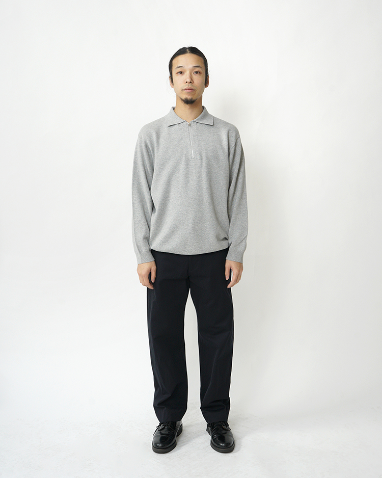 太ももワタリはややゆとりを持たせ、裾に向かって緩やかにテーパードを効かせた細身のシルエットのチノパンツです。