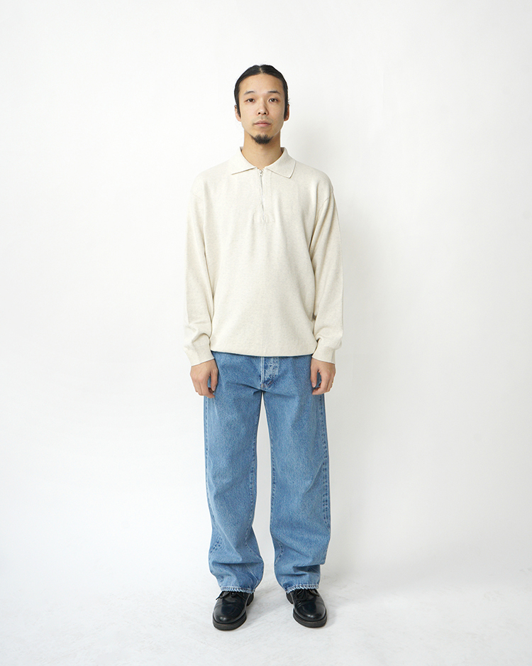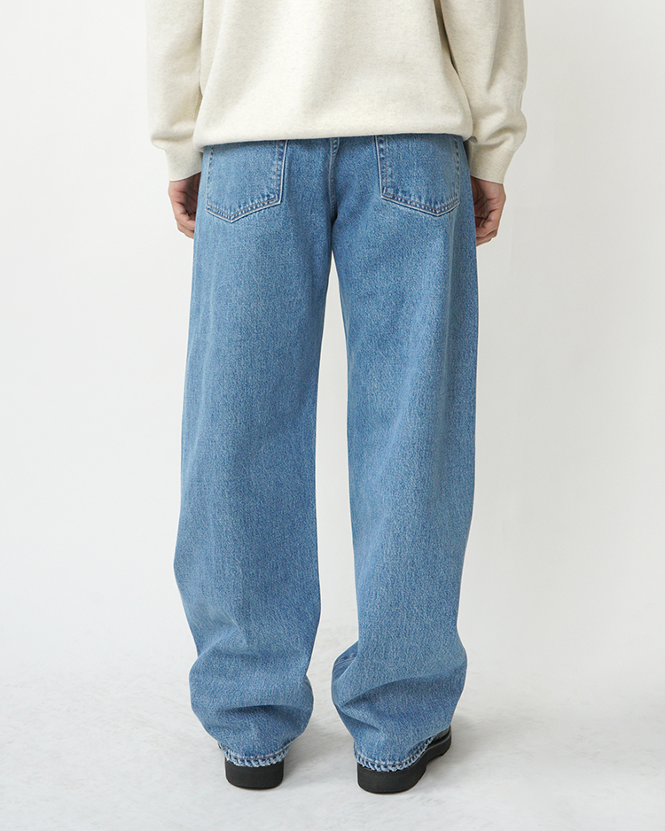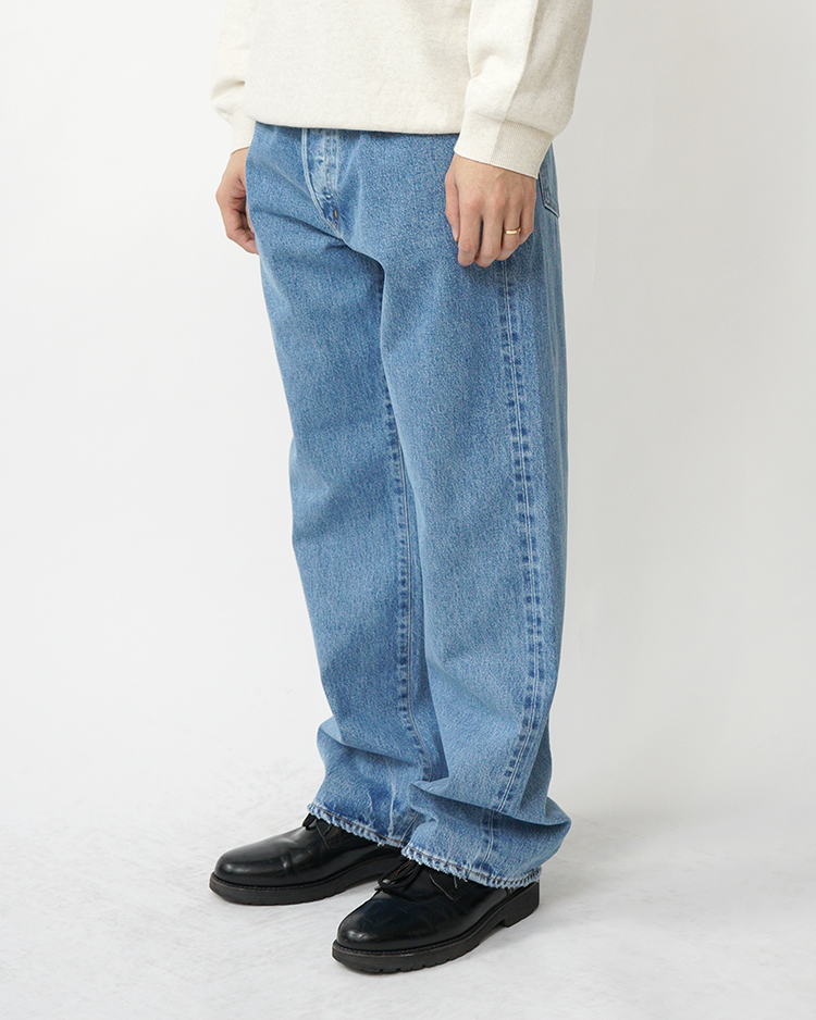 オリジナルの13.5ozデニムは、旧力織機で織られた白耳のセルビッチデニム。隠しリベットや渡り閂、環縫いなど本格的なデニム仕様。フェイド加工は職人の手によって1本ずつ加工を施されたこだわりの加工です。加工している為生地の特性上斜行があります。#020(GREY)は経糸、横糸ともに硫化ブラックで染め、製品洗い加工の負担を低減した新しい技術を採用。#110(BLUE)は、水を40%、化学薬品を50%削減したサスティナブルな染色。503をベースにしたストレートシルエットのデニムです。外脇セルヴィッチ耳使用。