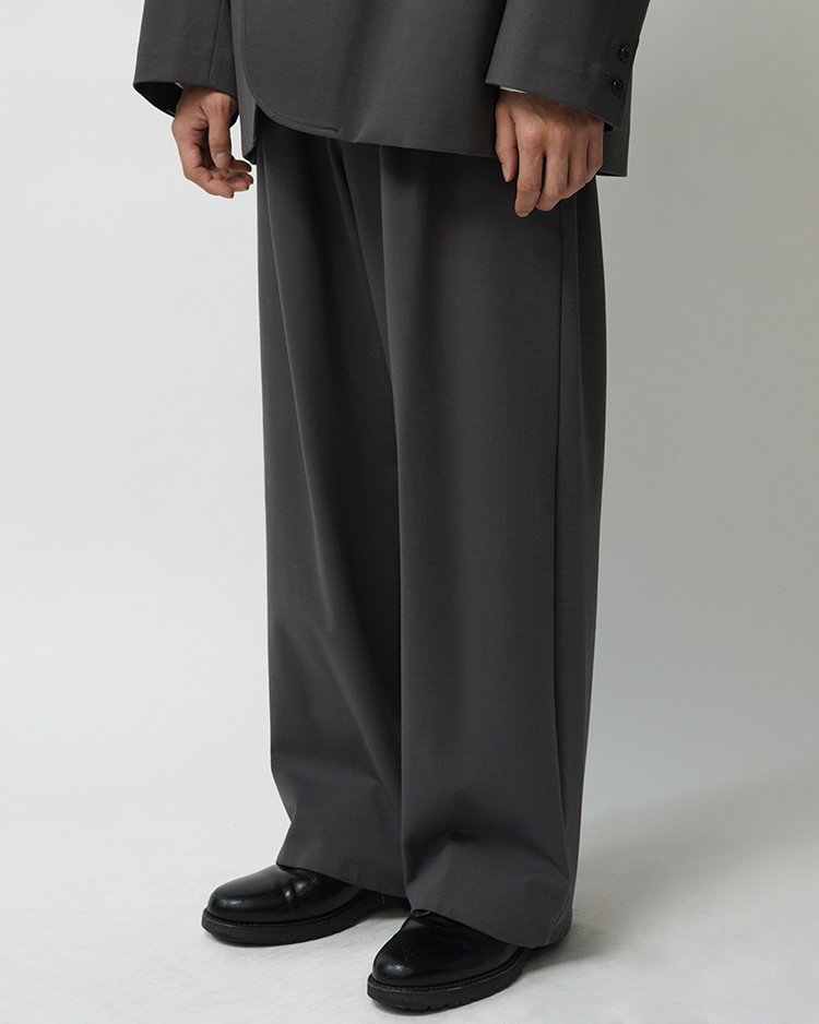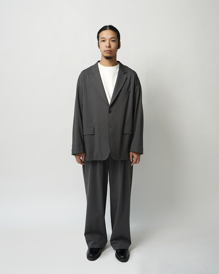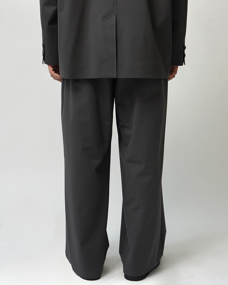 フランスのシェフパンツをべースにしたGraphpaper定番のボリュームのあるワイドパンツ。ウエストのサイズを簡単に調整できてシルエットもアレンジ可能。ハイゲージの編機で製作し、布帛のように見えながら縦横にストレッチ性のあるオリジナルのポンチ素材は美しい光沢とハリ感が特徴です。