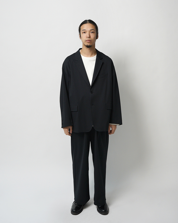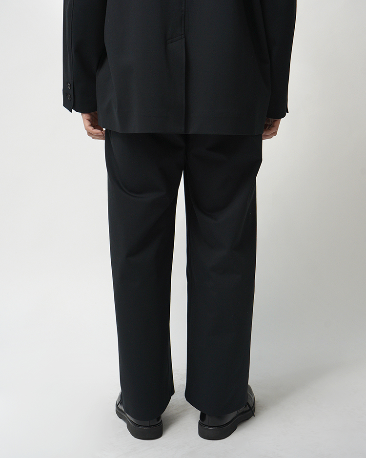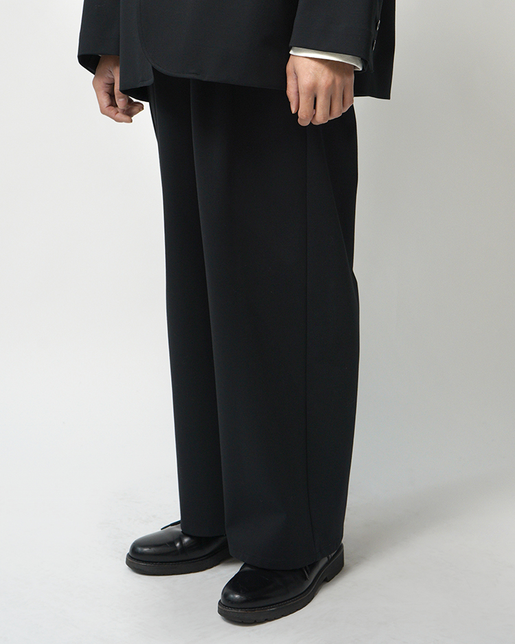 フランスのシェフパンツをべースにしたGraphpaper定番のボリュームのあるワイドパンツ。ウエストのサイズを簡単に調整できてシルエットもアレンジ可能。ハイゲージの編機で製作し、布帛のように見えながら縦横にストレッチ性のあるオリジナルのポンチ素材は美しい光沢とハリ感が特徴です。