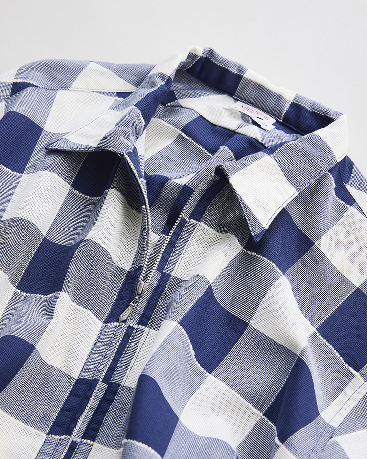細番多本取りの強撚糸と意匠糸を組み合わせたイタリア製デッドストック生地で製作したロングジッププルオーバーシャツ。型は1940年代のドレスシャツのパターンをリファレンスとし、シンプルながら一枚で様になるデザインを追求しカジュアルに着こなせるよう再設計。生地は通気性を高めるためやや甘めに織り上げられ、独特なオールド感が漂います。大ぶりなカンガルーポケットを配し、ジップを開ければブルゾンのように羽織れる仕様です。現在では手間のかかるこのような生地を新たに作るのは難しく、デッドストックならではの希少な風合いを楽しめます。
