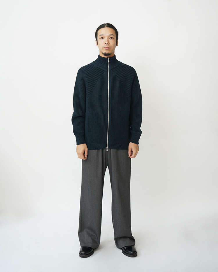 SIGNATUREシリーズの為に開発したSOLIDWOOLという糸を使用。ダレにくく、毛玉になりにくい商品で編み目の立体感が特徴。BATONERらしい象徴的な編み柄が際立つ商品。