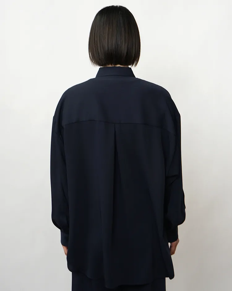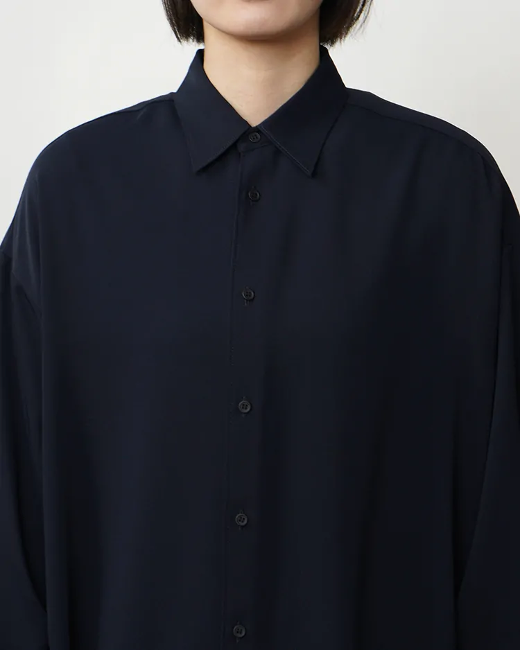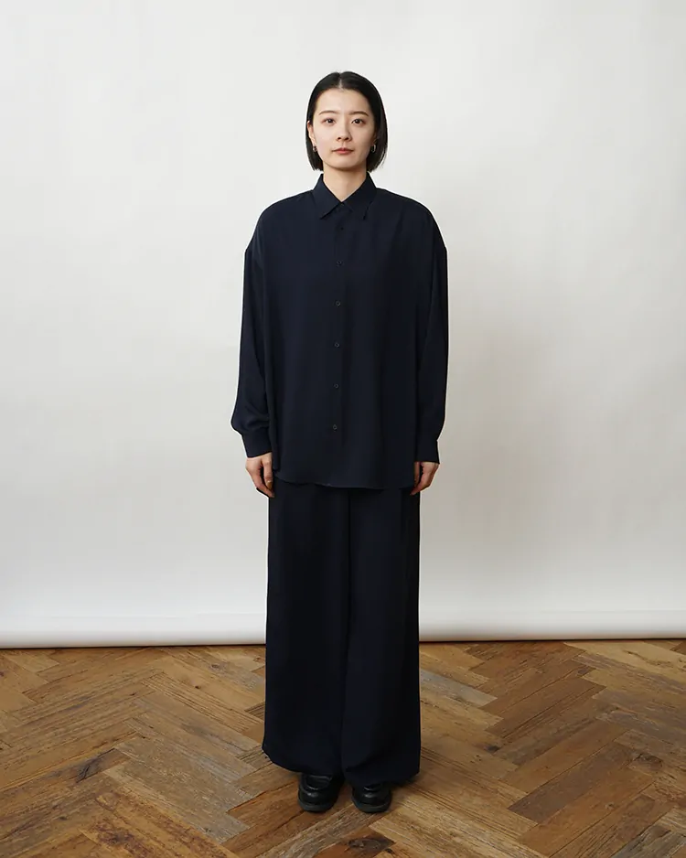 柔らかく落ち感のあるダブルサテンを使用した、レギュラーカラーのオーバーサイズシャツ。シワになりにくく日常的に使える利便性も兼ね備えた一着です。たっぷりとボリュームのあるシルエットが動くたびに揺れ、美しくドレープします。