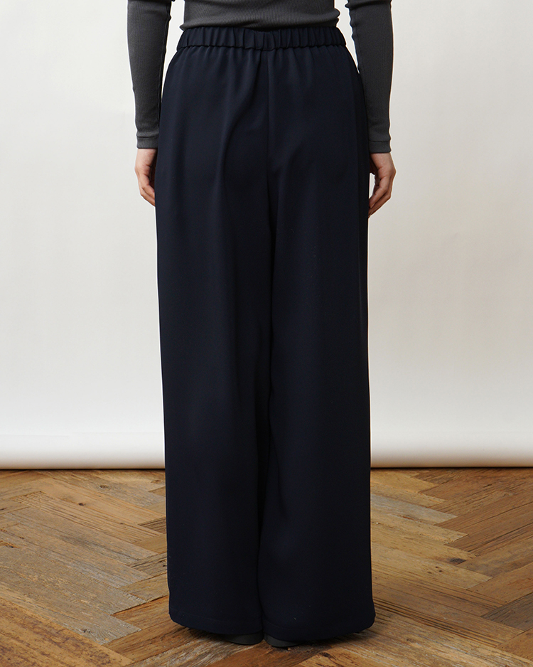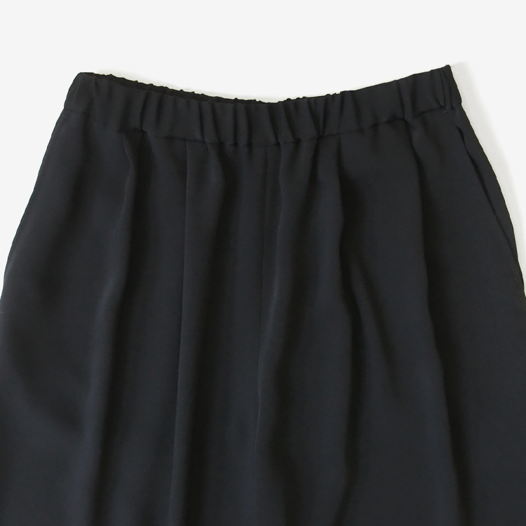 ダブルサテンを使用したワイドパンツ。ウエストゴムでリラックス感もあり履き心地も抜群。