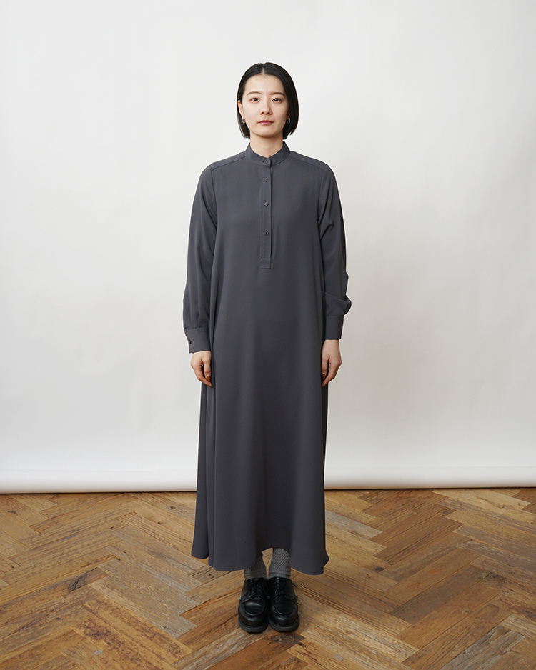 ダブルサテンを使用したバンドカラードレス。シーズン毎にカラーを変化させながら継続している人気のモデル。貝ボタンもボディと同色に染めたミニマルな仕様で季節を問わず多様なシーンに対応できるシルエットと素材が人気。