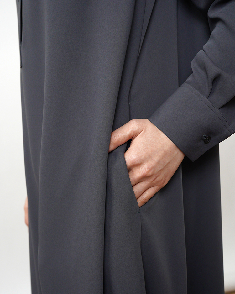 『不朽の名作です。サテンの二重織の生地を使ってて、何がいいかというと、透けない、裏地がいらない、だから軽い。しかも上からかぶるだけ簡単に着られて面倒臭くない。肩はコンパクトで、裾にかけては少しAラインのシルエット、生地分量もあるのでドレープが出て、きちんと見える素材だから一つ着るだけでキマるので楽。パンツと合わせてもいいし、意外とどんなシーンにも使えるということで、年齢問わず幅広い女性に人気です。コンセプト自体はメンズと一緒なんで、もともと軍モノのシャツをベースにしてるんですけど、女性らしくいかに変えるかがテーマ。例えば麻で作ったら、ちょっと野暮ったくほっこりしちゃうんで、あくまでもモダンさを重視してます。女性も試着していると、ポケットがない服なのに手を入れる仕草をする人が多いので、ポケットもつけときました。』