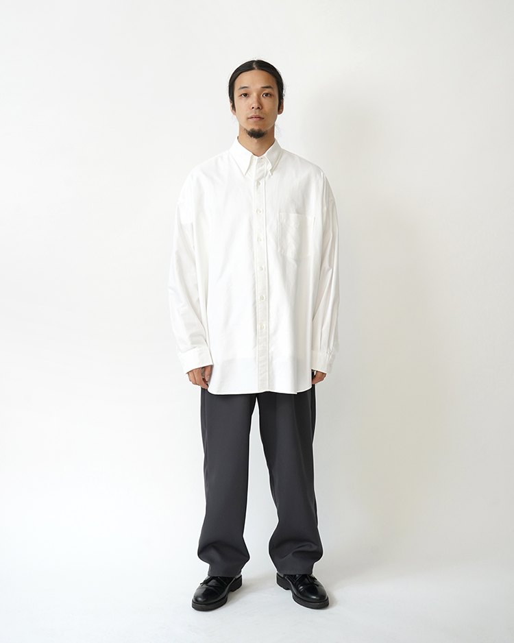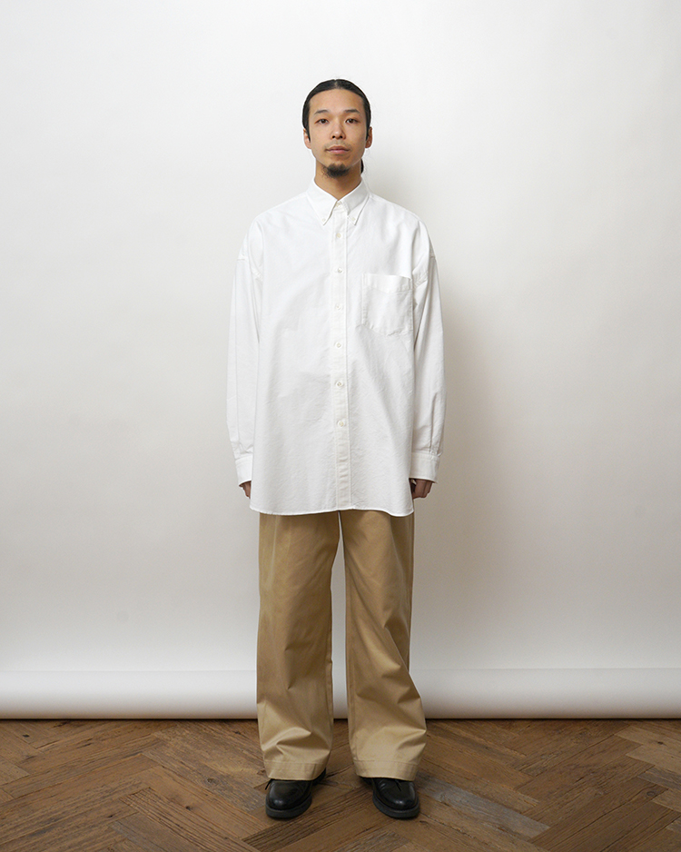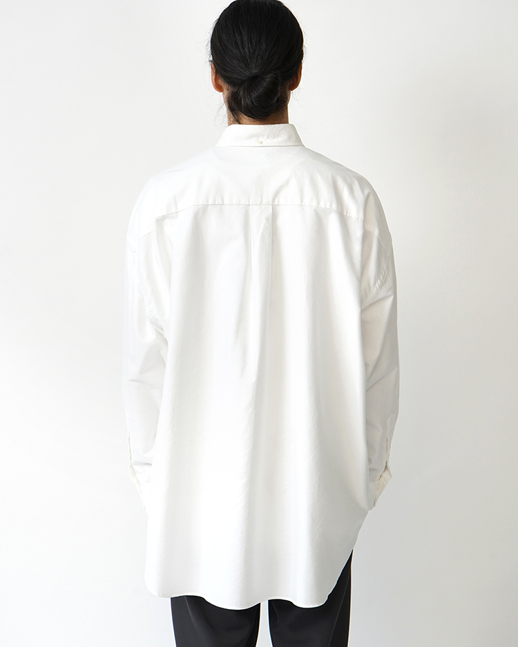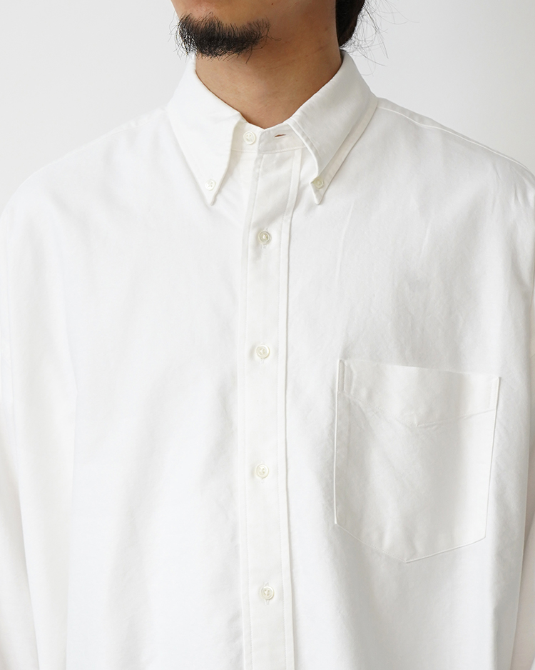 肩の傾斜や低く下げられたヨークの位置、アームホールの広さなど、細かなディテールを特異なバランスで仕上げたオーバーサイズシルエットが特徴のボタンダウンシャツ。太めの綿糸を使用し肉厚に仕上げたオックスフォード生地を使用。