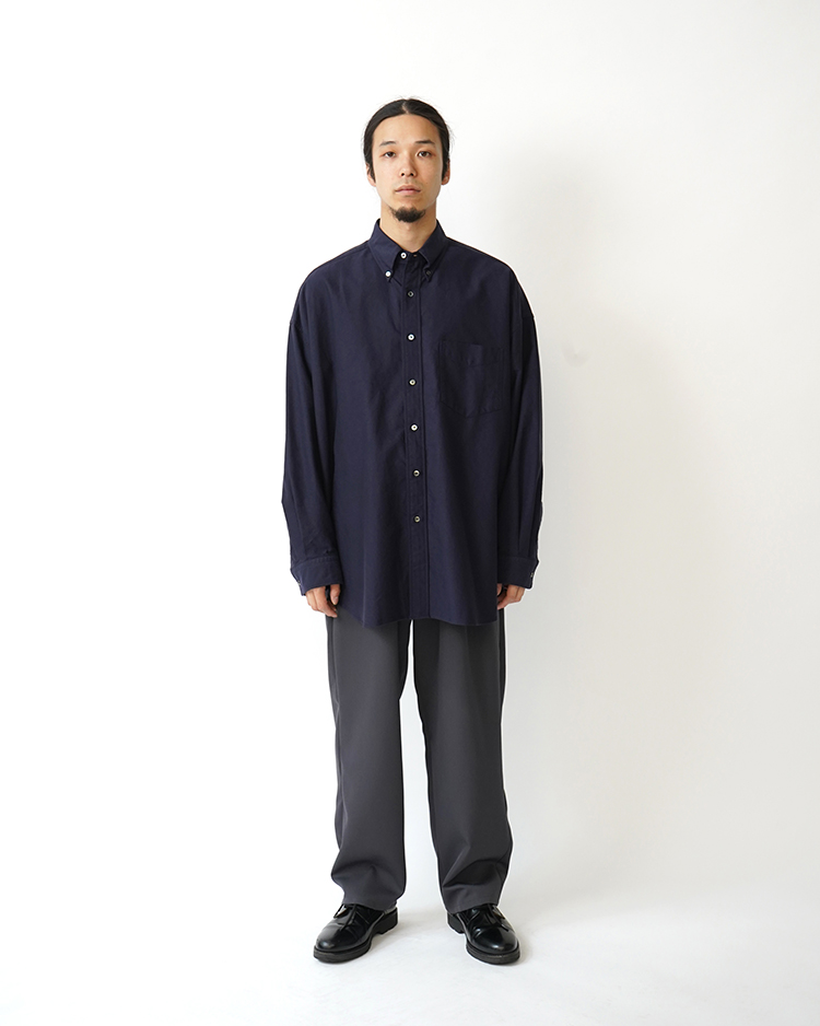 肩の傾斜や低く下げられたヨークの位置、アームホールの広さなど、細かなディテールを特異なバランスで仕上げたオーバーサイズシルエットが特徴のボタンダウンシャツ。太めの綿糸を使用し肉厚に仕上げたオックスフォード生地を使用。