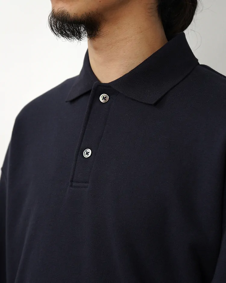 アズマ機という旧式編機を使用したオリジナルの裏毛。表面のきれいに揃った天竺目、膨らみとハリ感、裏面のループ分量まで幾度も調整を重ねた拘りの素材を使用してます。度目を詰めることで実現したダレにくさもポイント。程よくゆったりとしたボディのプルオーバースウェットポロ。体型に合わせて好みのバランスで着こなせる3サイズ展開。