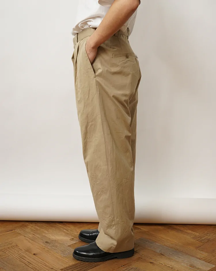 左右に2本、タックの入ったリラックス感のあるパンツです。股上は深く、腰回りはゆったり。たっぷりとした太さのあるストレートです。