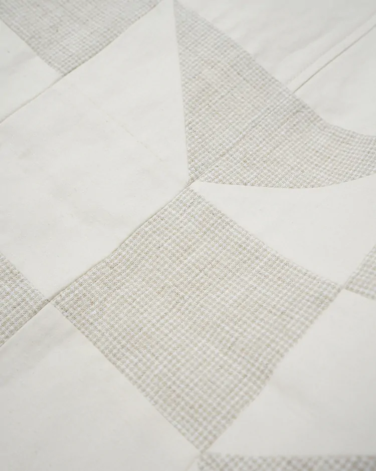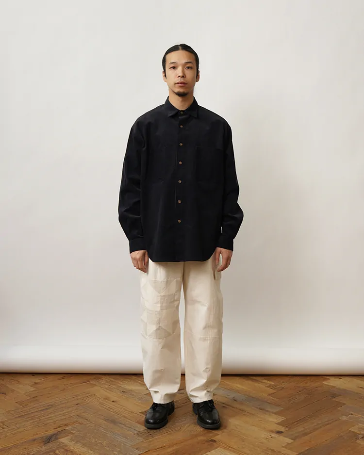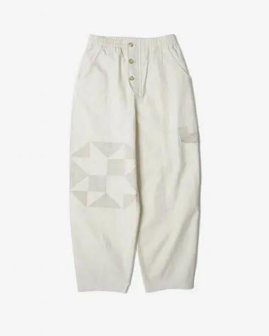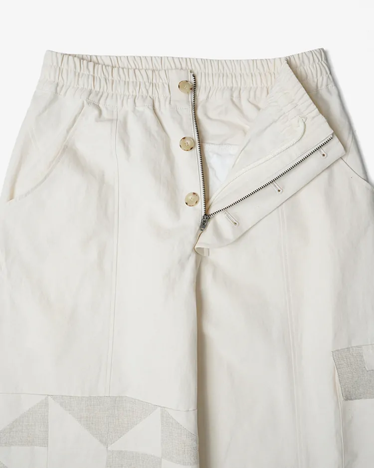 ドローコードつきのウエストゴムのイージーパンツ。右膝に幾何学模様の太陽のパッチワークを施しました。Ivoryは洗いの晒し感ある綿麻のバックサテン生地を使用。ワタリ部分にボリュームがあり裾にかけてテーパードされたシルエット。
