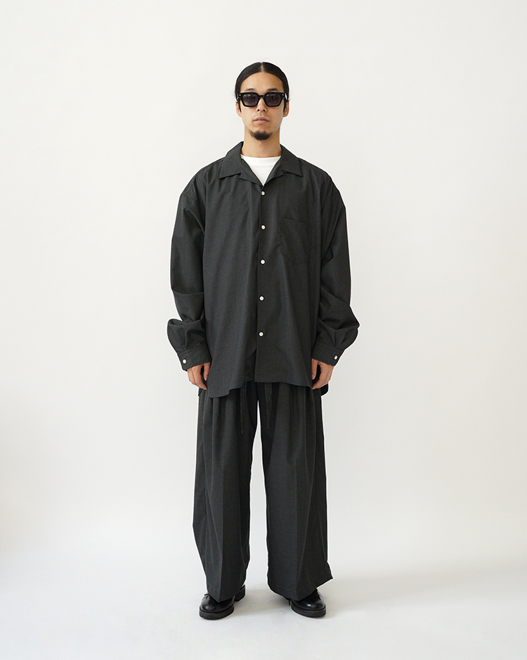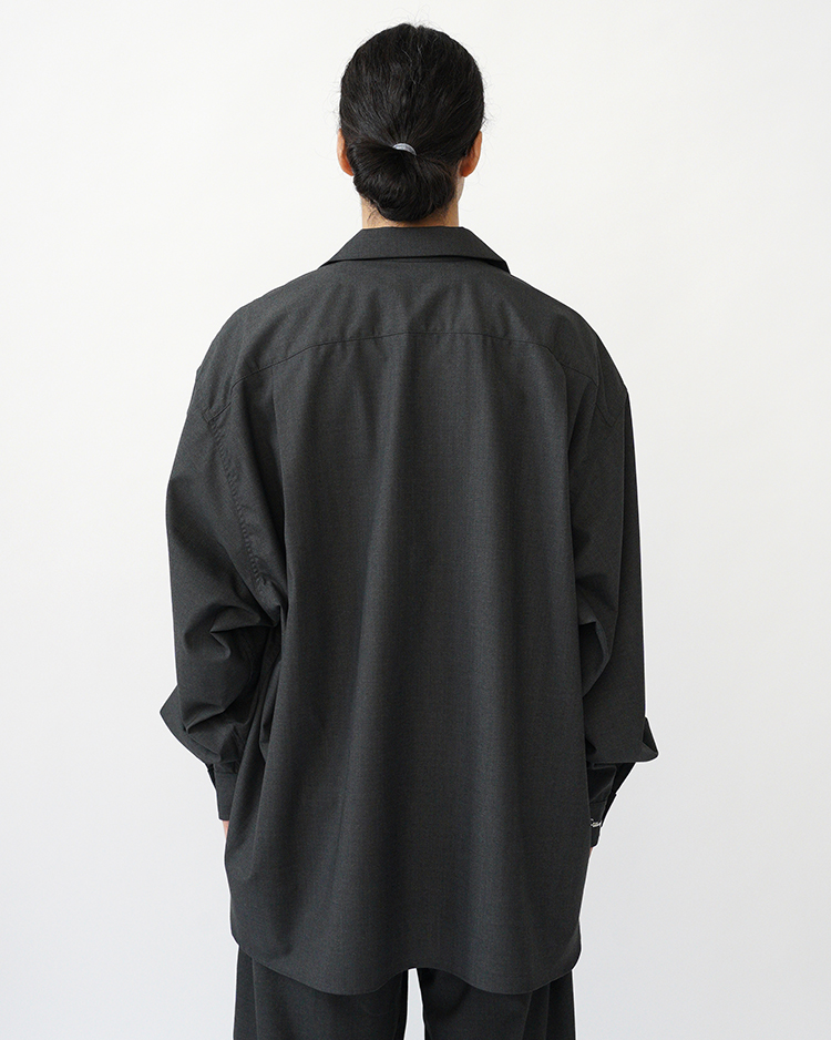 ESSENTIAL コレクションとしてオープンカラーのオーバーシャツ仕様。羽織りとして使っていただくこともインナーとしてジャケットと合わせていただくことも可能。パンツのチョイスでセットアップの全体のシルエットをお好みに変化させられます。素材は定番のウールトロピカル。 着丈を長くしたニューバージョンです。