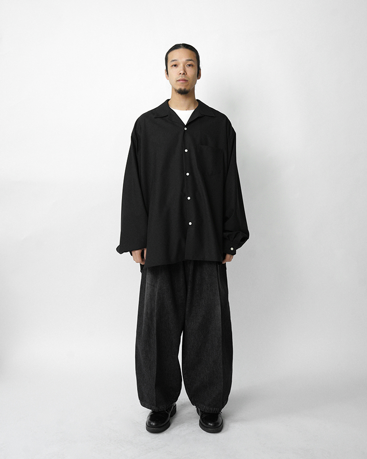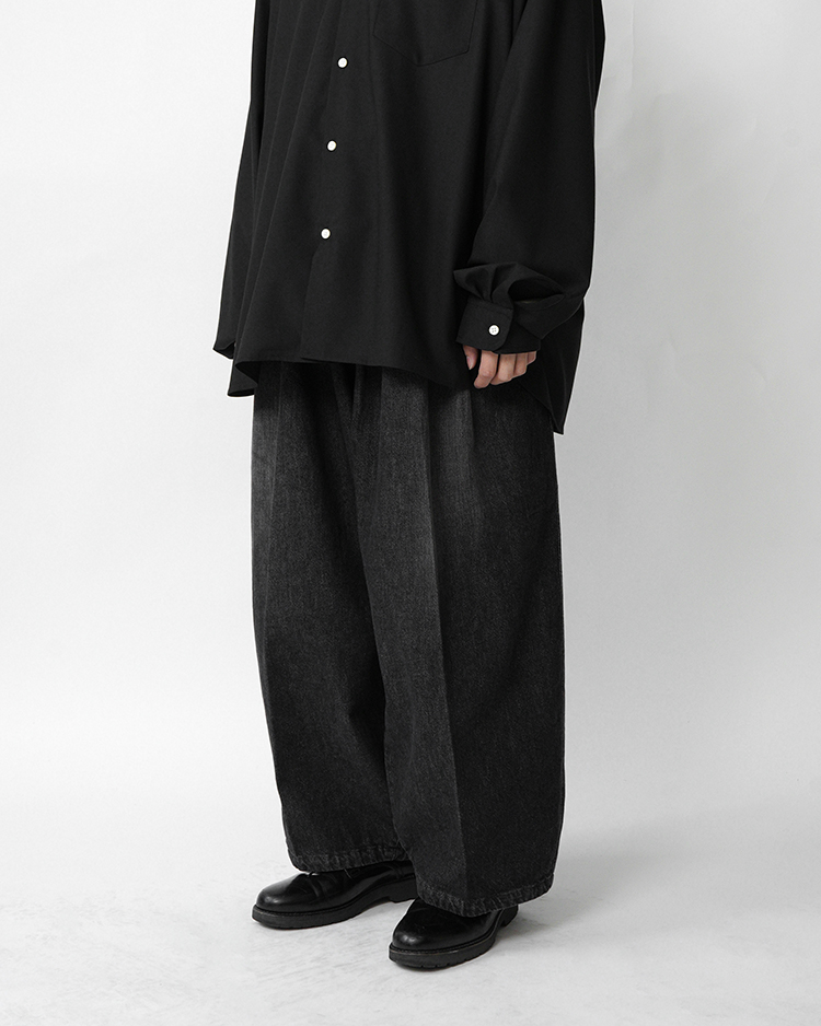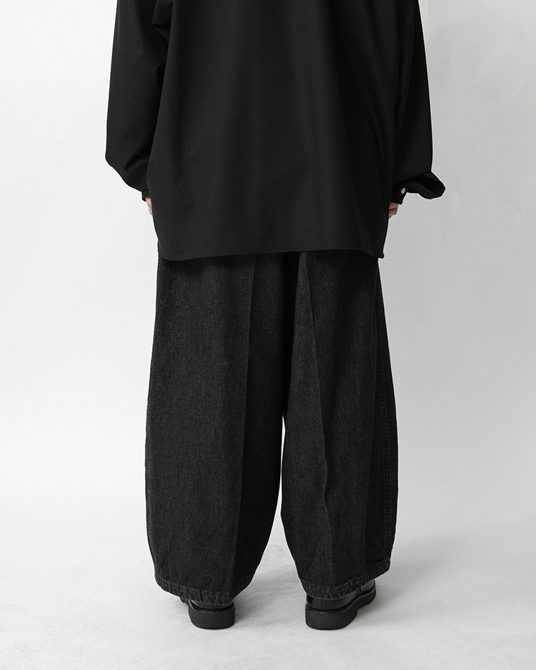 Sillage オリジナル デニムコレクション。岡山の老舗デニムミルにてじっくりと織り上げました。 生地でワンウォッシュをかけています。リジットよりも柔らかく履きやすいです。スタイルは”CIRCULAIRE” サーキュラーパンツ。非常にワイドで円を描くようなシルエットが特徴のSillageを代表するパンツ。ワイドでゆったりとしたシルエットながら急激なテーパードから生まれるドレープがこのパンツの唯一無二の美しさです。アイコニックな2本のドローコードにストッパーをつけ、履きやすさを提案しています。
