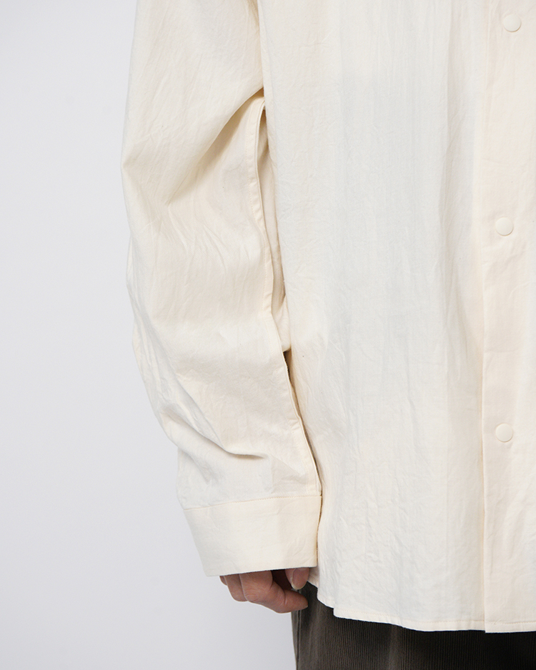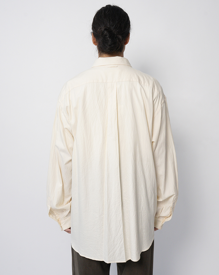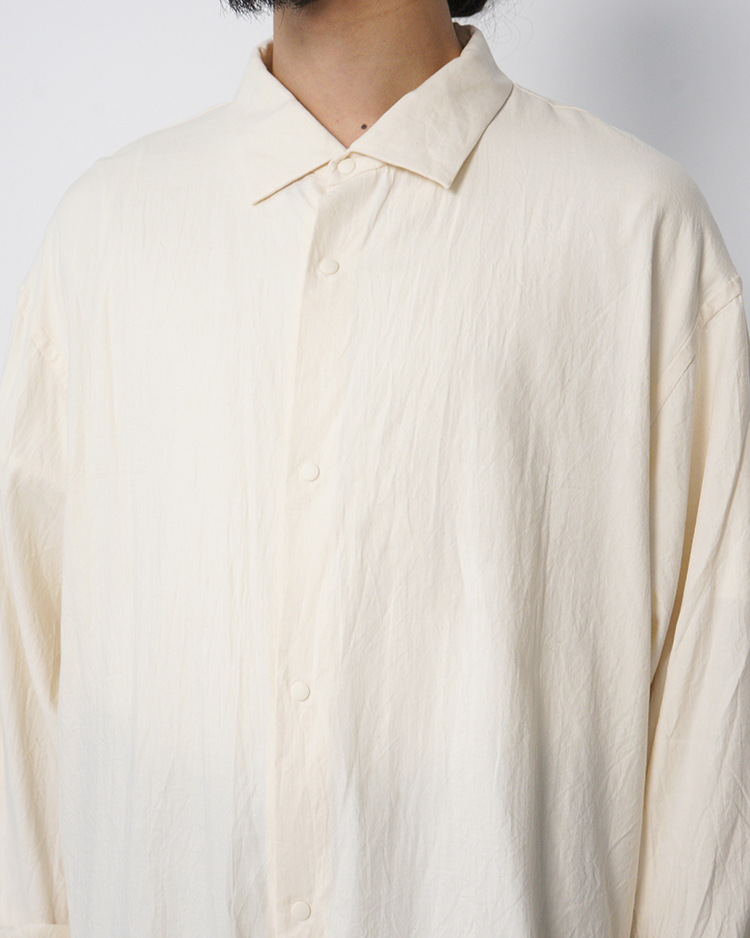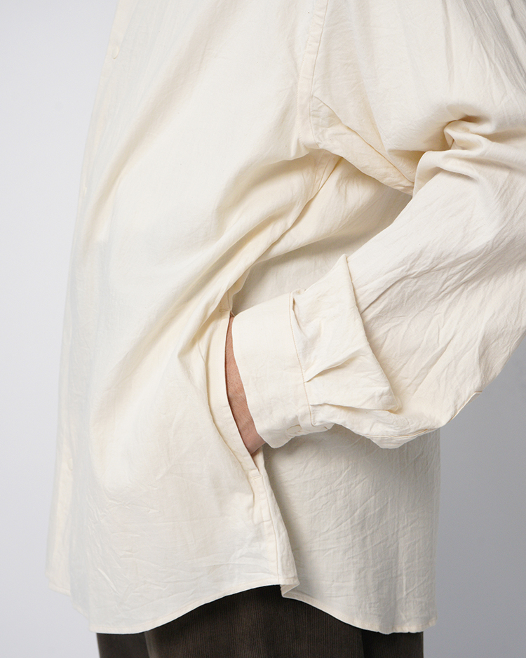 YAECAの定番「エクストラワイドコンフォートシャツ」をベースに、Dice&Dice の別注仕様として製作されたモデルです。通常展開のないFREEサイズで仕立て、肩幅・身幅にゆとりを持たせたリラックス感のあるシルエットはそのままに、本作は第二弾となる別注モデル。袖丈を見直すことでバランスを調整し、カラーには落ち着いたベージュを採用しました。