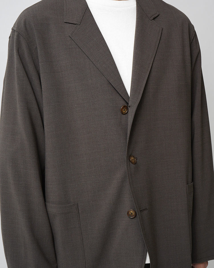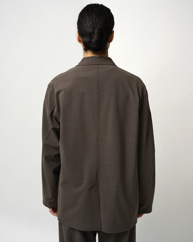 "上質な日本製のウールブレンド生地を採用。ウール本来の上品な質感を保ちながら、優れた伸縮性を実現し、長時間でもリラックスした着心地を提供します。適度な張りがあり、シワになりにくい特性も魅力です。ご家庭での洗濯も可能で、手入れのしやすさも備えています。UNGLAMOUSEと""旅""をテーマに共同制作したセットアップジャケットは、旅先でも快適に過ごせる心地よいシルエットと機能性を追求しました。クラシックなブレザーを基にした一重仕立てで、ゆとりあるシルエットと洗練されたシンプルなディテールが特徴です。程よい厚みの生地は、シーズンを問わず着用いただけます。