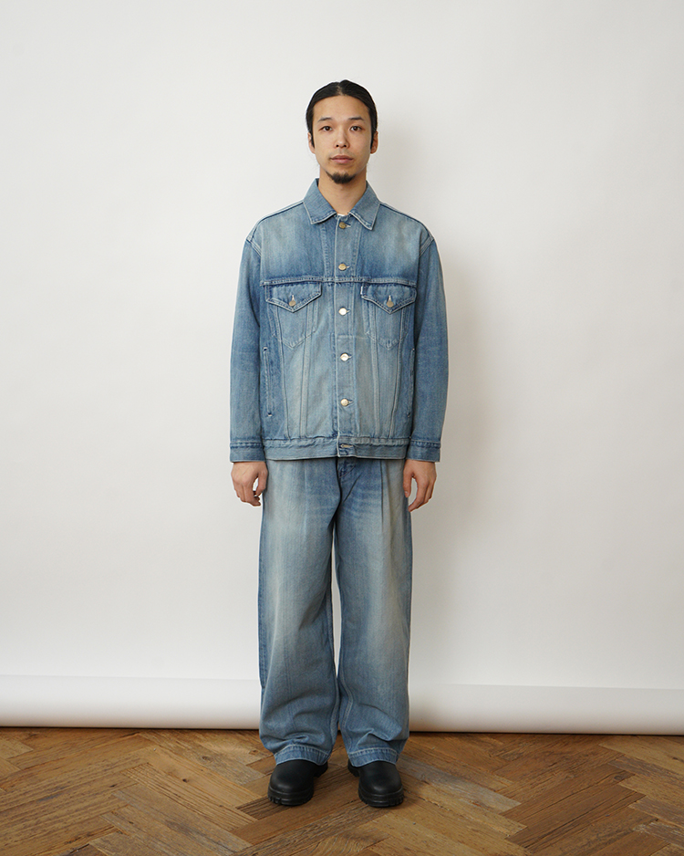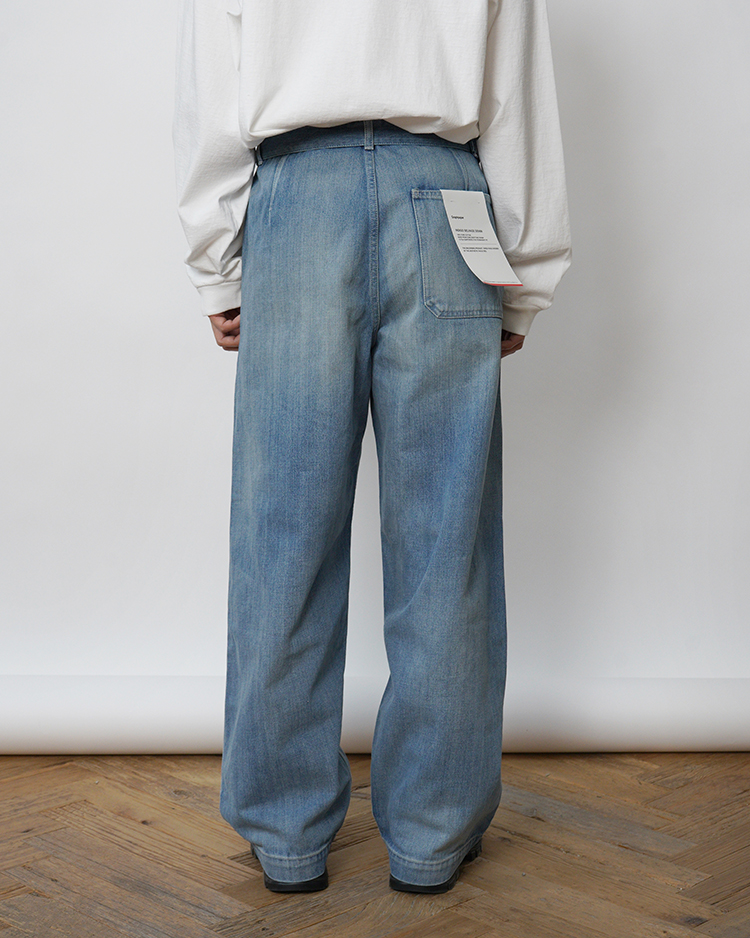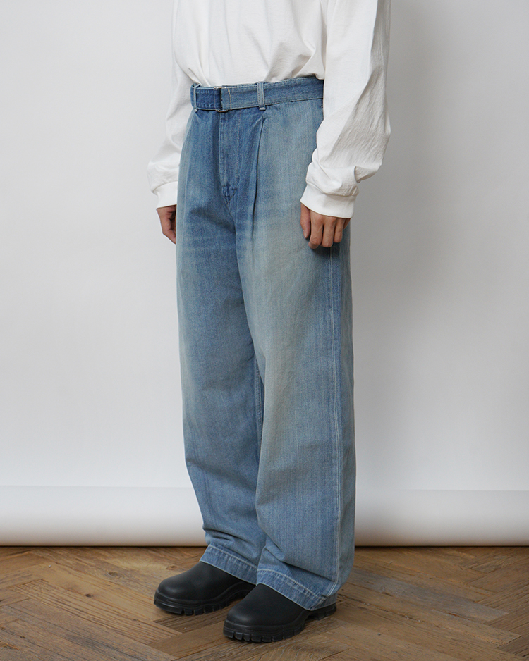 130年もの歴史を誇る米国Cone Denim社が作る13.75オンスのセルビッチデニム。デニム生地に最も適した原綿をブレンドし、独自のノウハウで紡ぎ、濃色のピュアインディゴで染色した縦糸は鮮やかで自然なタテ落ちを表現。旧式力織機でゆっくりと織り上げることで生まれる、生地表面のざらっとした凹凸やムラがデニム本来の風合いを感じさせる魅力的な素材です。共生地のベルトをあしらい、フロントには1タックを入れ、腰まわりに適度な余裕を持たせ裾にかけて若干テーパードをかけたワイドシルエット。ライトフェイドは長く使い込まれたような淡い色合いが特徴です。