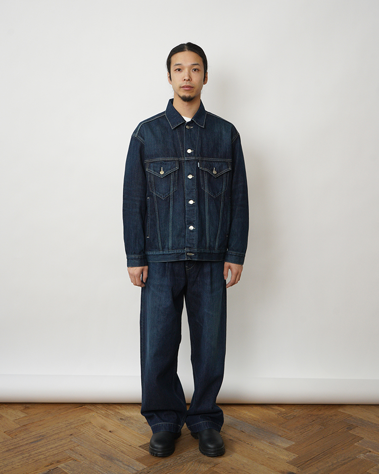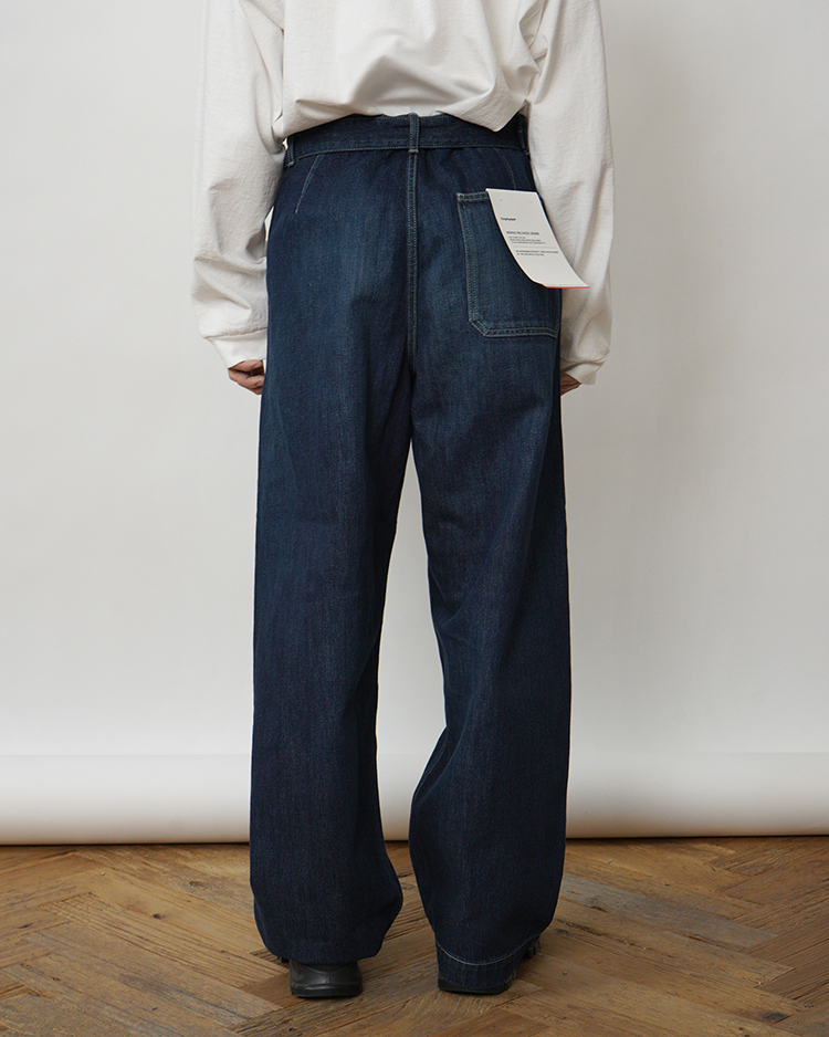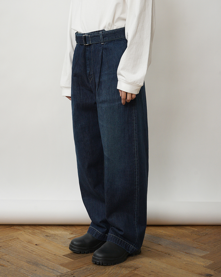 130年もの歴史を誇る米国Cone Denim社が作る13.75オンスのセルビッチデニム。デニム生地に最も適した原綿をブレンドし、独自のノウハウで紡ぎ、濃色のピュアインディゴで染色した縦糸は鮮やかで自然なタテ落ちを表現。旧式力織機でゆっくりと織り上げることで生まれる、生地表面のざらっとした凹凸やムラがデニム本来の風合いを感じさせる魅力的な素材です。共生地のベルトをあしらい、フロントには1タックを入れ、腰まわりに適度な余裕を持たせ裾にかけて若干テーパードをかけたワイドシルエット。ダークフェイドカラーはメリハリのある濃淡が特徴です。