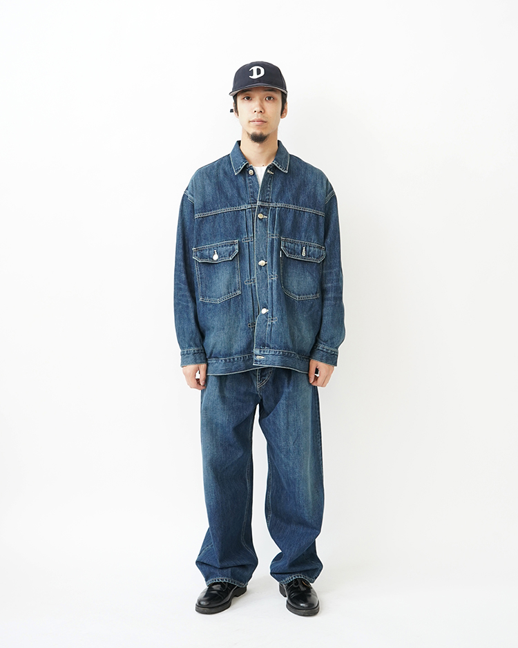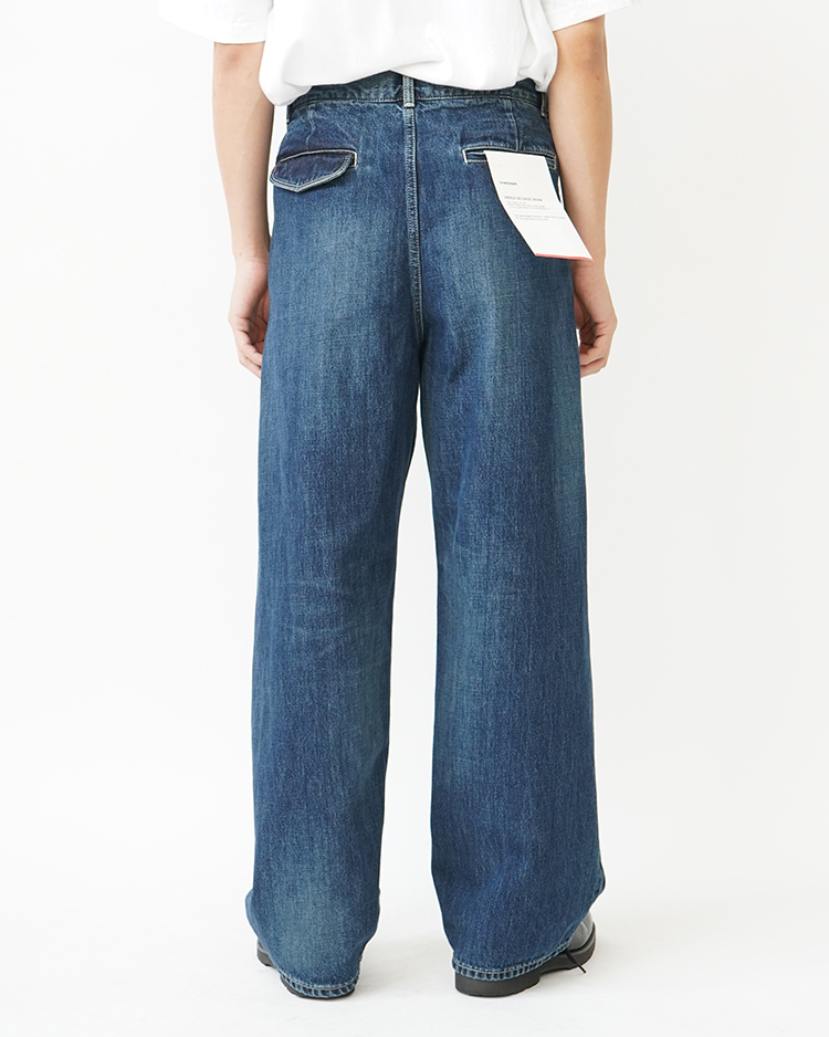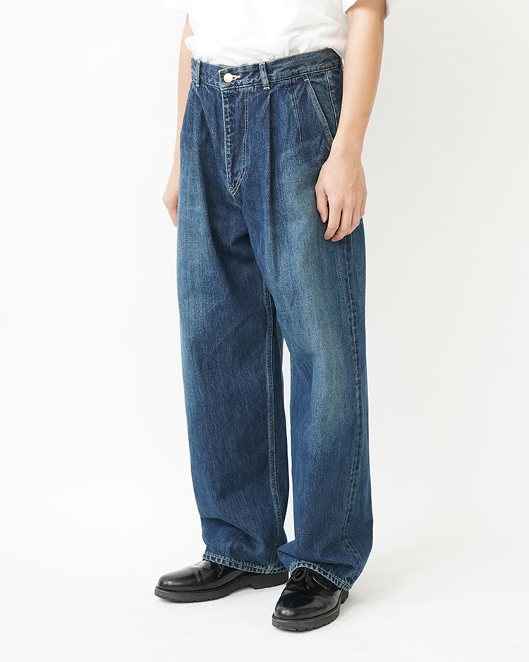 130年もの歴史を誇る米国Cone Denim社が作る13.75オンスのセルビッチデニム。ウエストにはタックが入り、ヒップからワタリにかけて適度な余裕があるワイドストレートパンツ。旧式力織機でゆっくりと織り上げることで生まれる、生地表面のざらっとした凹凸やムラがデニム本来の風合いを感じさせる魅力的な素材。ダークフェイドはメリハリのある濃淡が特徴です。