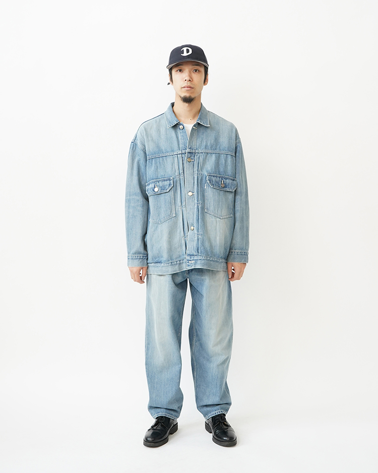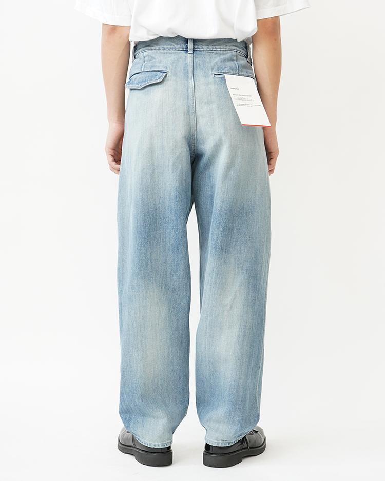 130年もの歴史を誇る米国Cone Denim社が作る13.75オンスのセルビッチデニム。ウエストにはタックが入り、ヒップからワタリにかけて適度な余裕があり、裾にかけて若干テーパードしている履きやすいワイドテーパードパンツ。旧式力織機でゆっくりと織り上げることで生まれる、生地表面のざらっとした凹凸やムラがデニム本来の風合いを感じさせる魅力的な素材です。ライトフェイドは長く使い込まれたような淡い色合いが特徴です。