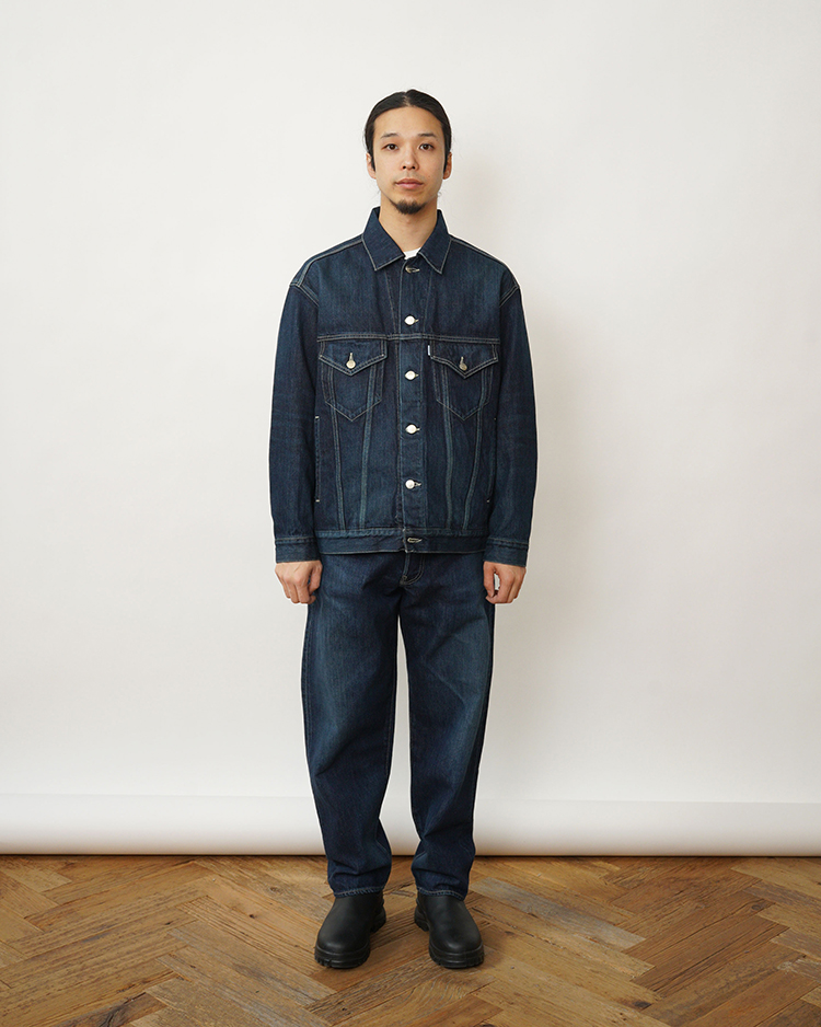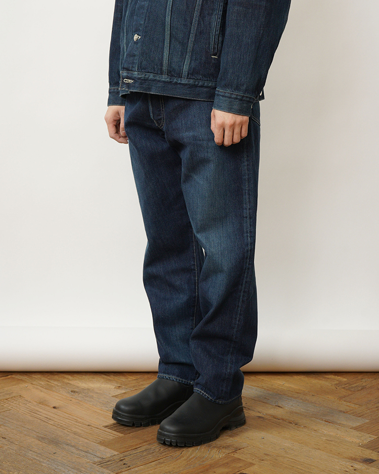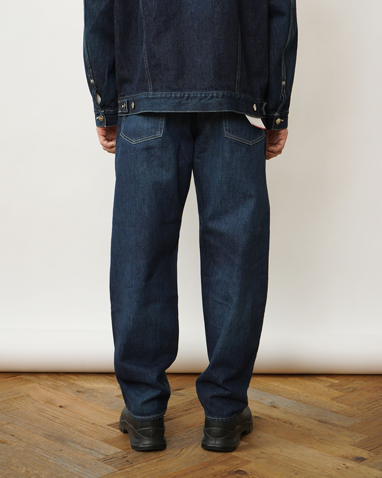 130年もの歴史を誇る米国Cone Denim社が作る13.75オンスのセルビッチデニム。旧式力織機でゆっくりと織り上げることで生まれる、生地表面のざらっとした凹凸やムラがデニム本来の風合いを感じさせる魅力的な素材です。ゆったりとした腿回りから、裾にかけて緩やかにテーパードさせたリラックスフィットのファイブポケットパンツ。ロゴの刻印入りのタックボタンとウエストにはクリーンなヌメ革のパッチを施しました。ダークフェイドカラーはメリハリのある濃淡が特徴です。