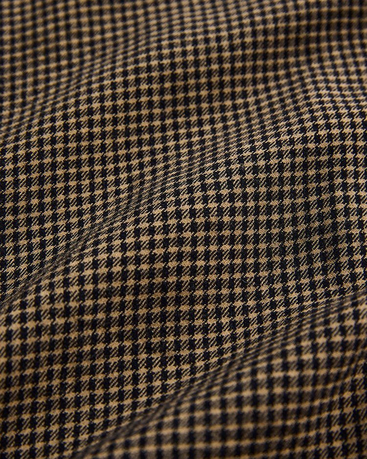 Super140’sの原料を用いたツイルチェック生地で製作したオープンカラードレスシャツ。型は英国のミリタリーシャツをリファレンスとし、袖の設計やフロント構成にフランスのドレスシャツの要素を取り入れ、フォーマルさとラフさが共存する一枚に。生地はあえてローカウントで織り上げることで糸の膨らみを引き出し、特殊な起毛加工により軽やかで柔らかな風合いを実現。洗練された佇まいと快適な着心地を両立させ、カジュアルからモードまで幅広く対応できるシャツに仕上げています。