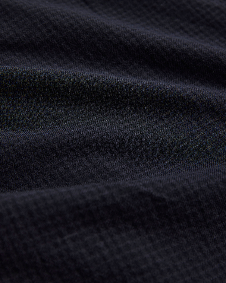 Super140’sの原料を用いたツイルチェック生地で製作したオープンカラードレスシャツ。型は英国のミリタリーシャツをリファレンスとし、袖の設計やフロント構成にフランスのドレスシャツの要素を取り入れ、フォーマルさとラフさが共存する一枚に。生地はあえてローカウントで織り上げることで糸の膨らみを引き出し、特殊な起毛加工により軽やかで柔らかな風合いを実現。洗練された佇まいと快適な着心地を両立させ、カジュアルからモードまで幅広く対応できるシャツに仕上げています。
