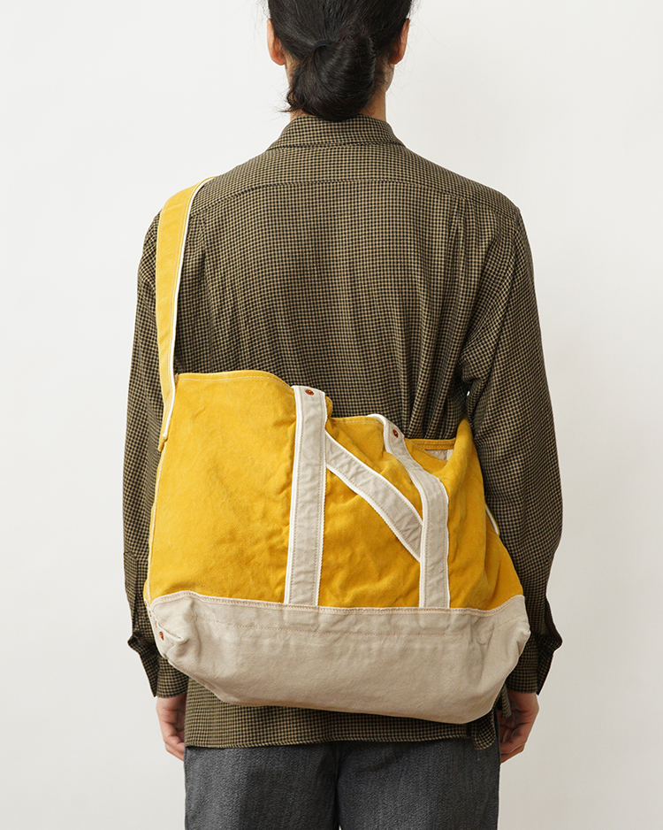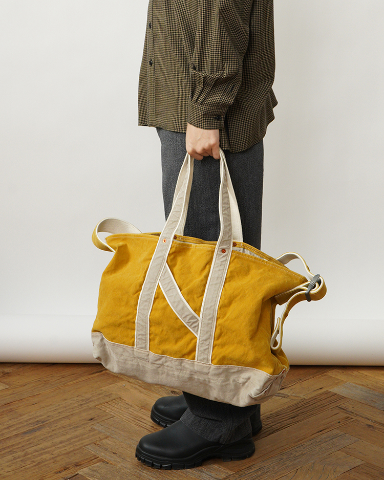1920~50s にかけて現れたUSツールバックからインスピレーションを受け、現代的解釈を取り入れ製作したNNショルダートートバッグ。 長い歴史の中でも作りや形状が変わらないオールドな仕様に惚れ込みました。 N型のハンドルなどショルダーバッグとして使いやすい形状にアップデートしたオリジナルデザイン。 生地は国産のシャトル織機にて織り上げらた6号と10号帆布にワッシャー加工を施し、 再度製品後に特殊加工を施すことでビンテージのキャンバスに見られる独特のやれたアタリ感を演出しています。