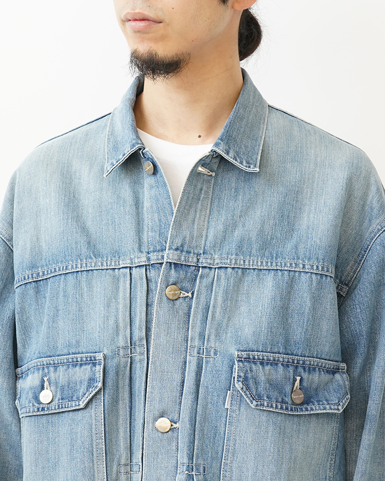 130 年もの歴史を誇る米国 Cone Denim 社が作る13.75 オンスのセルビッチデニム。旧式力織機でゆっくりと織り上げることで生まれる、生地表面のざらっとした凹凸やムラがデニム本来の風合いを感じさせる魅力的な素材。’ 50 年代に誕生した往 年のデニムジャケットのディテールを継承しながらも立体的にボリュームのあるシルエットを構築。ロゴの刻印入りのタックボタンを配し、クリーンなヌメ革のパッチが襟ぐりを飾る。長く使い込まれたような淡い色合いが特徴のライトフェイド。
