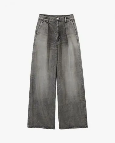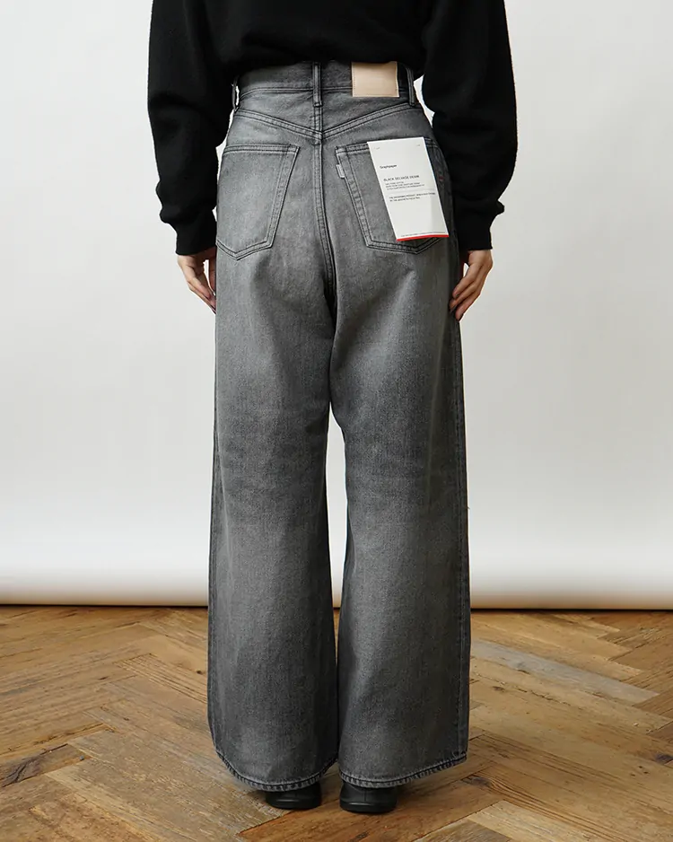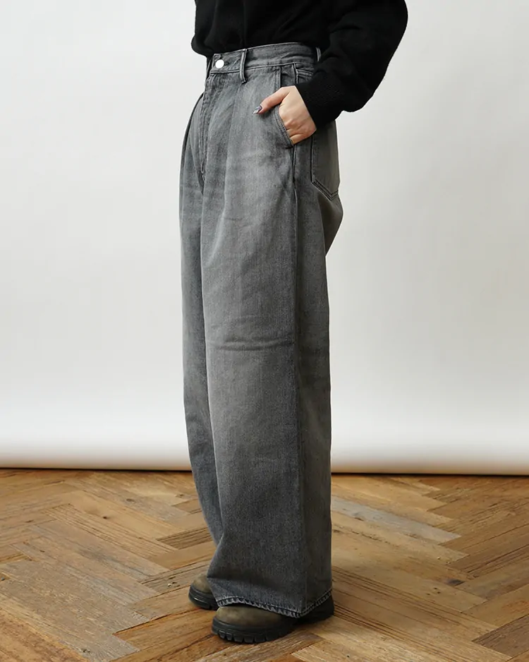 腰周りをスッキリと見せるハイウエストに、裾に向かってまっすぐ落ちる深めのタックが上品な印象を与えるハイウエスト設計のワイドストレートデニム。130年もの歴史を誇る米国Cone Denim社が作る13.75オンスのセルビッチデニム。旧式力織機でゆっくりと織り上げることで生まれる、生地表面のざらっとした凹凸やムラがデニム本来の風合いのある魅力的な素材です。ライトフェイドカラーは長く使い込まれたような淡い色合いが特徴です。