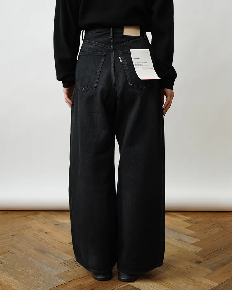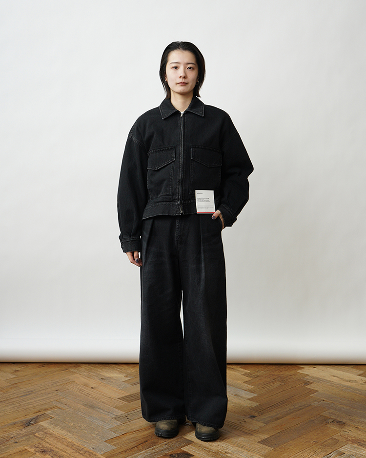 腰周りをスッキリと見せるハイウエストに、裾に向かってまっすぐ落ちる深めのタックが上品な印象を与えるハイウエスト設計のワイドストレートデニム。130年もの歴史を誇る米国Cone Denim社が作る13.75オンスのセルビッチデニム。旧式力織機でゆっくりと織り上げることで生まれる、生地表面のざらっとした凹凸やムラがデニム本来の風合いのある魅力的な素材です。ダークフェイドカラーはメリハリのある濃淡が特徴です。