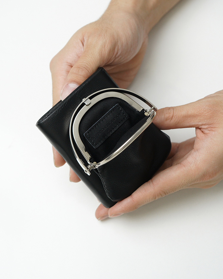 口金の外周についた金属フレームの両端を押して歪ませる事で、開閉する仕組みのがま口がついた三折りのコンパクトな財布です。