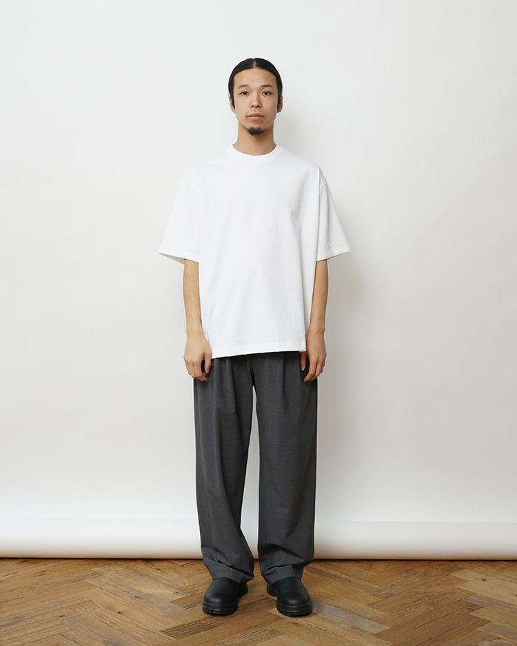ややオーバーサイズなボックスシルエットが特徴のTシャツ。首元はフライスでしっかりとつまっており、きれいすぎず、カジュアルすぎず、どんなシーンでも活躍してくれます。