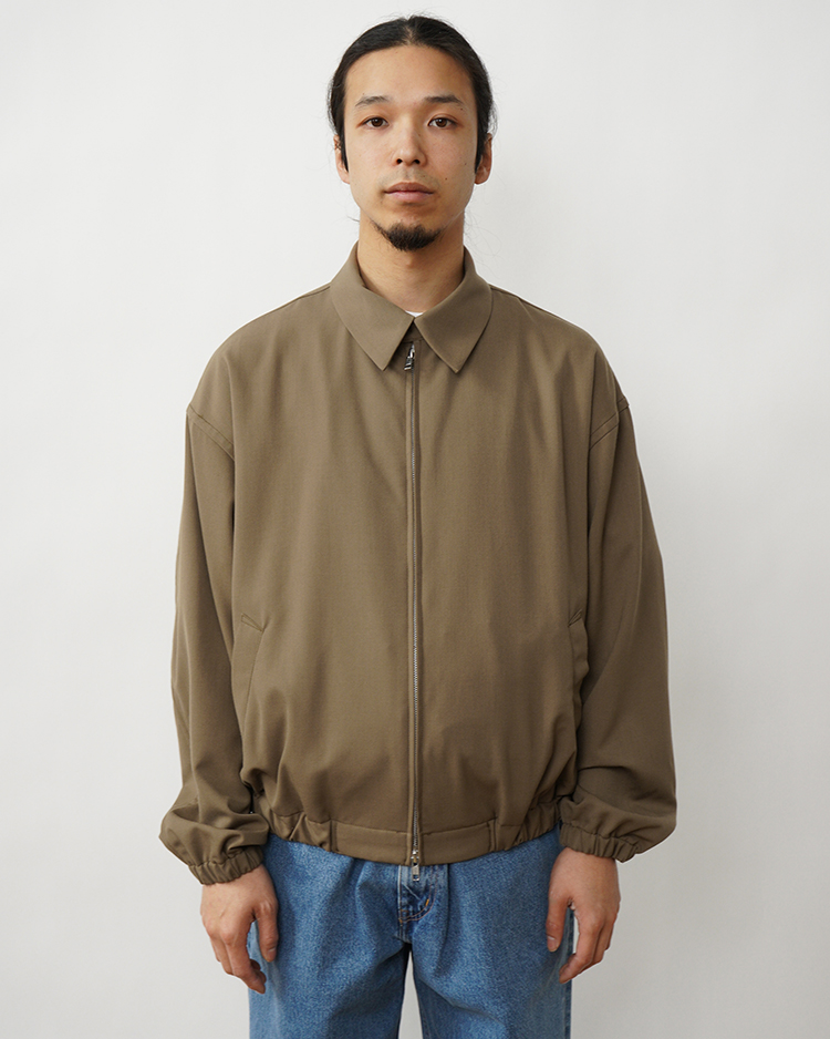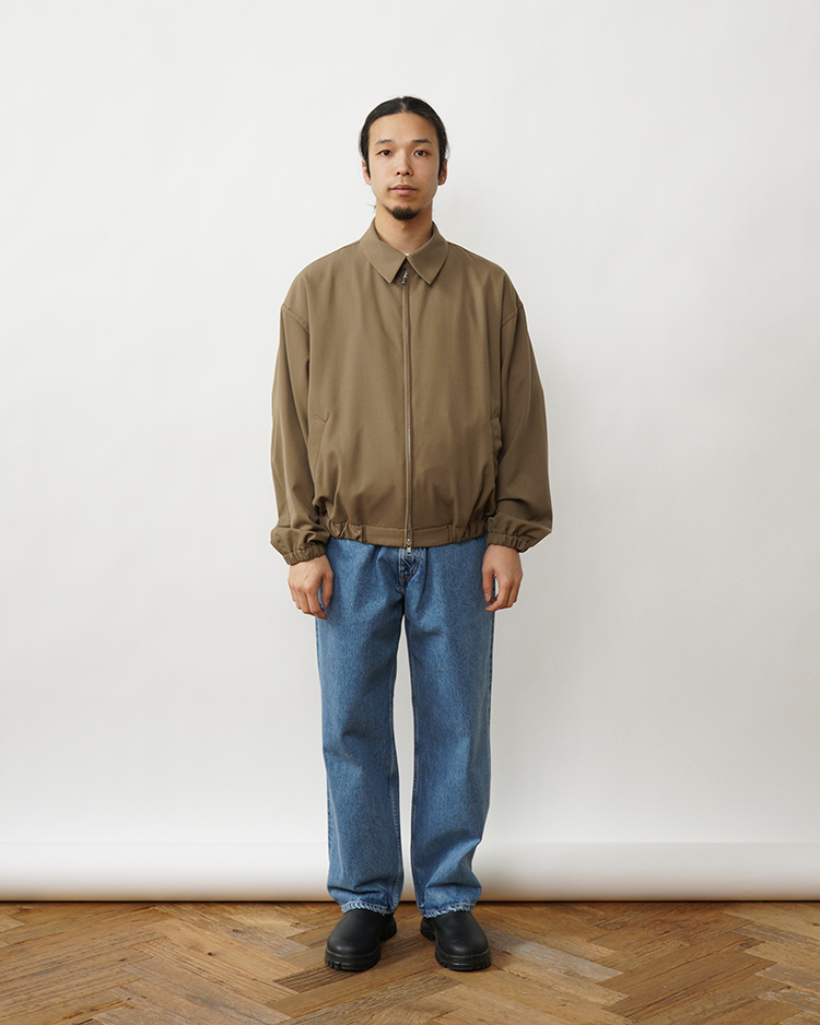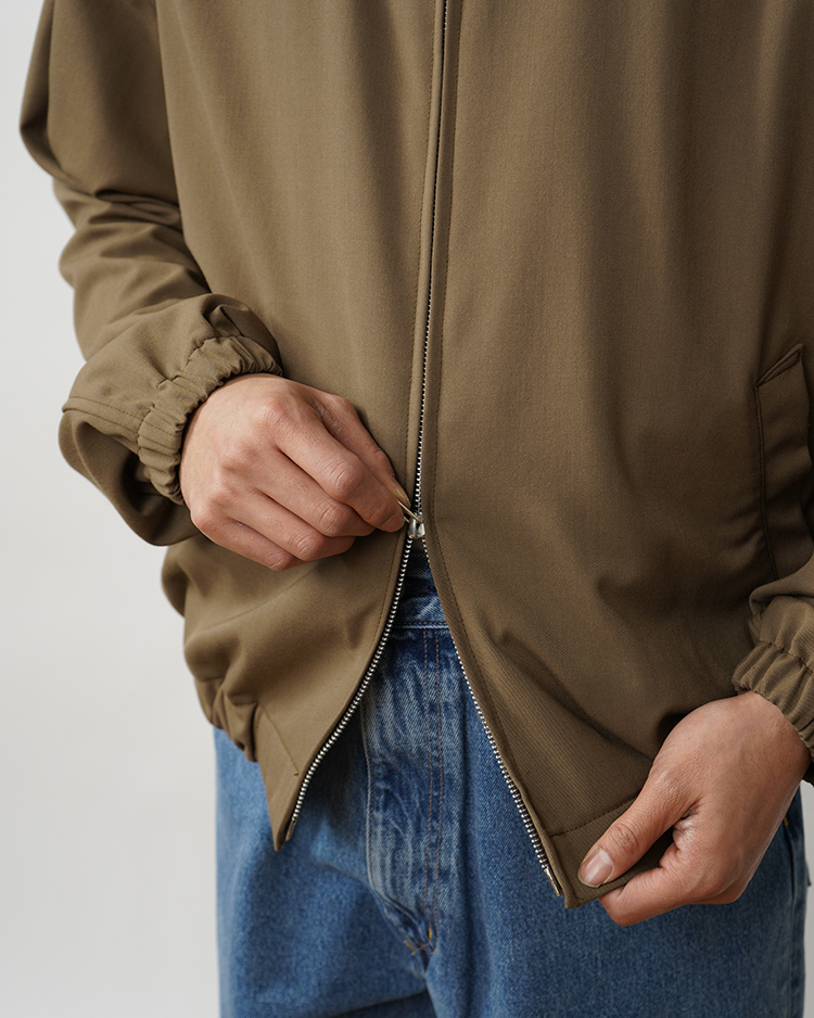 毛織物の産地である尾州で織り上げた、72番双糸のギャバジン素材を使用しています。高密度に織ることで、ハリとコシを備えながらも、しなやかで上品な風合いに仕上げました。シワになりにくく、立体的なシルエットを美しく保つ素材です。無駄を排したミニマルなデザインと、コンパクトなプロポーションが特徴のジップブルゾンです。
