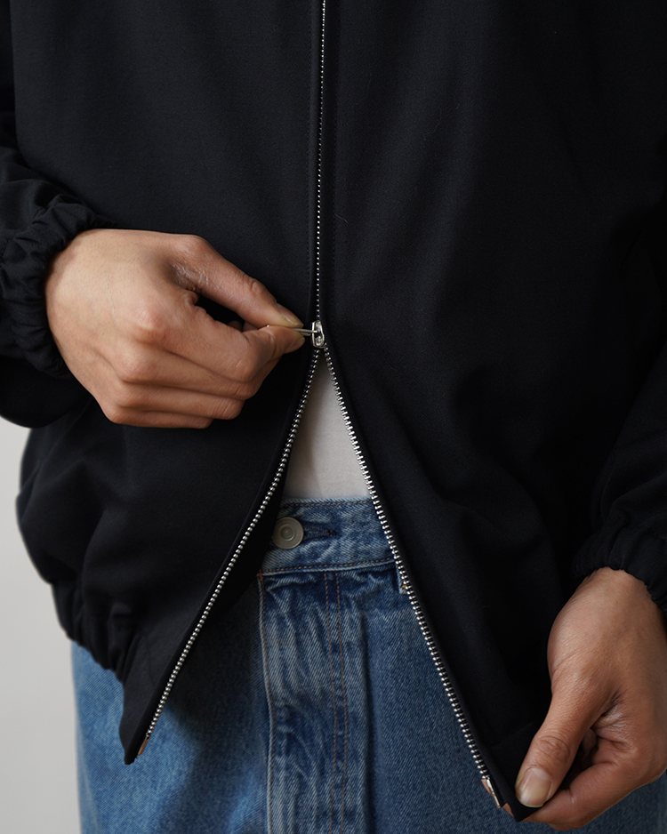 毛織物の産地である尾州で織り上げた、72番双糸のギャバジン素材を使用しています。高密度に織ることで、ハリとコシを備えながらも、しなやかで上品な風合いに仕上げました。シワになりにくく、立体的なシルエットを美しく保つ素材です。無駄を排したミニマルなデザインと、コンパクトなプロポーションが特徴のジップブルゾンです。