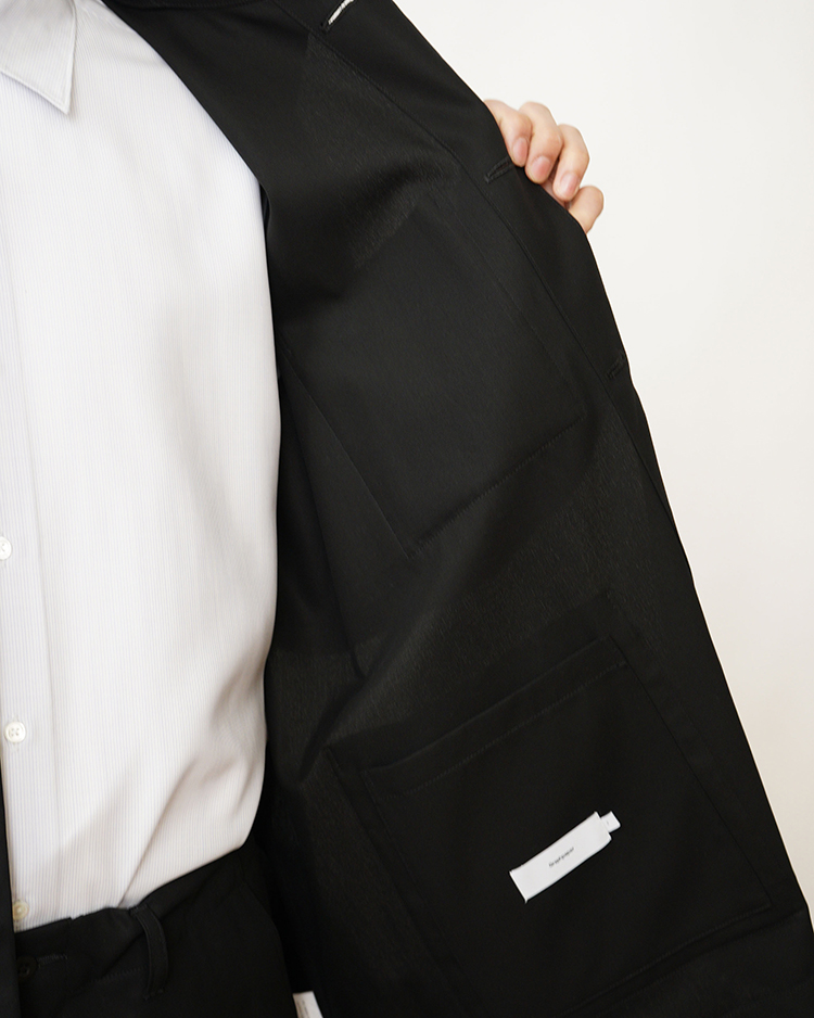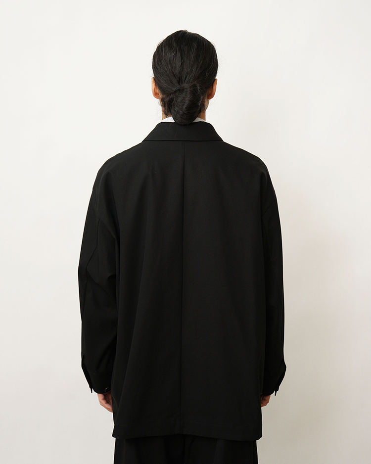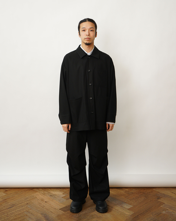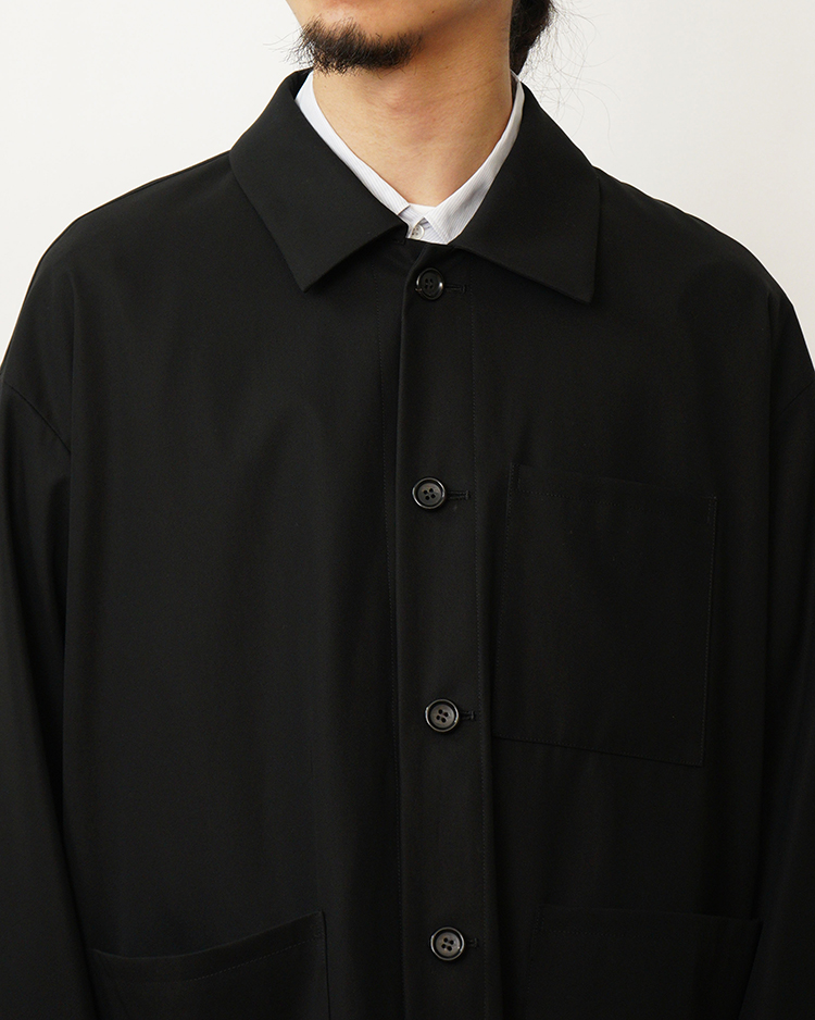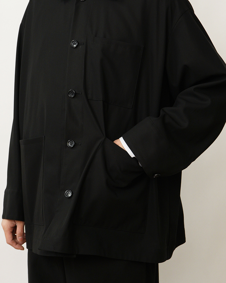 ワークウェアに代表されるカバーオールをベースに、最小限のステッチワークによってミニマルなアイテムにモダナイズされているジャケット。コットンの強撚糸をガス焼きして、毛羽立ちを押さえ合繊のようなクリアな質感を表現した高密度ギャバジンは、まるで梳毛のような品のある光沢とシャリ味のあるタッチと、シワになりにくい反撥感のある風合いが特徴の素材です。