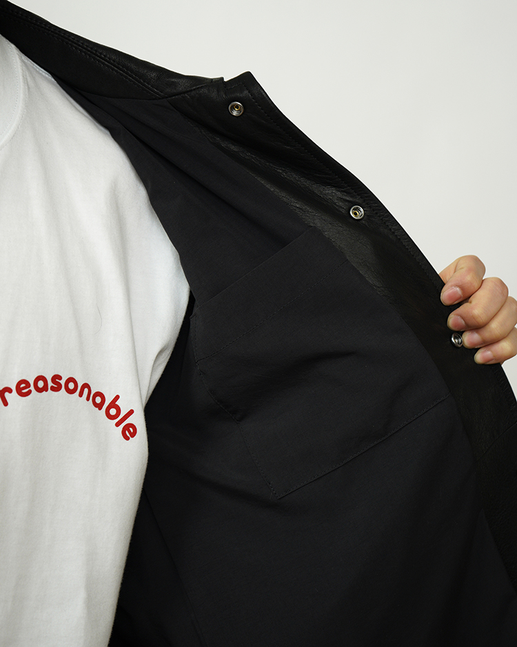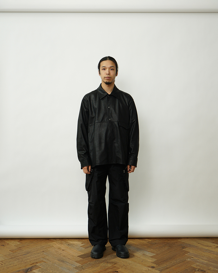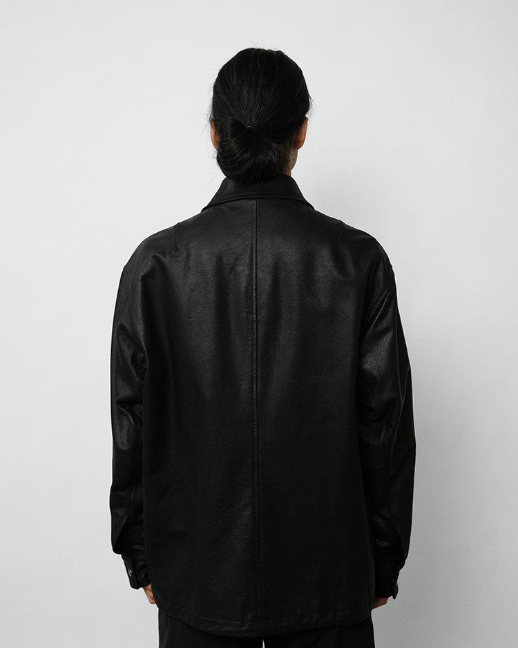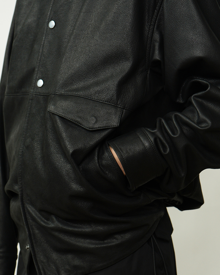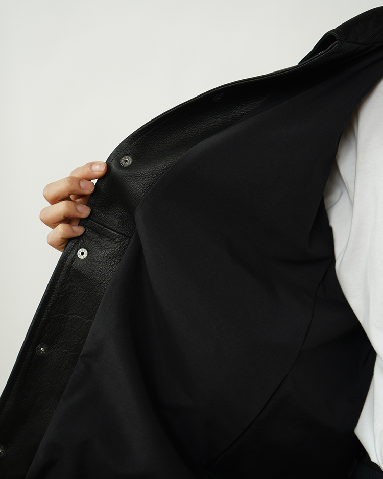 バッファローレザーを薄く漉き、ヌバック調に仕上げた後、レジン加工を施すことでマットな質感を表現したレザージャケット。