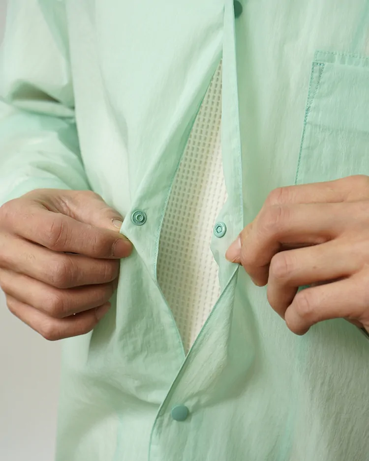 シアー感のあるウインドシェル生地で仕上げたユニークなアウターシャツ。透けたときの裏側の見え方にもこだわった、透け感を活かしたコーディネートを楽しめるアイテムです。