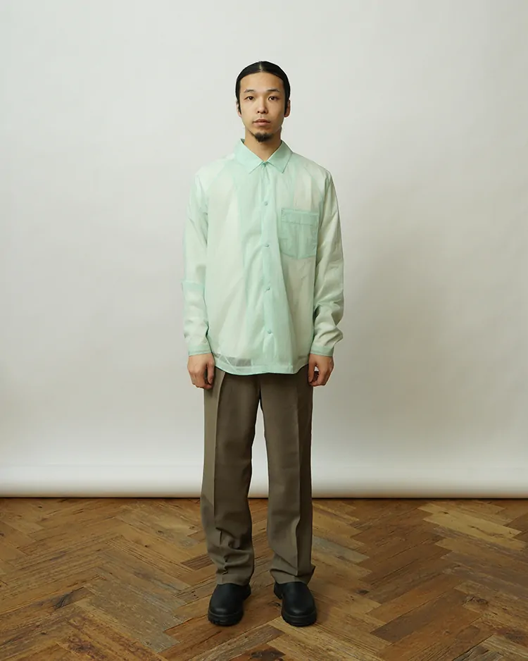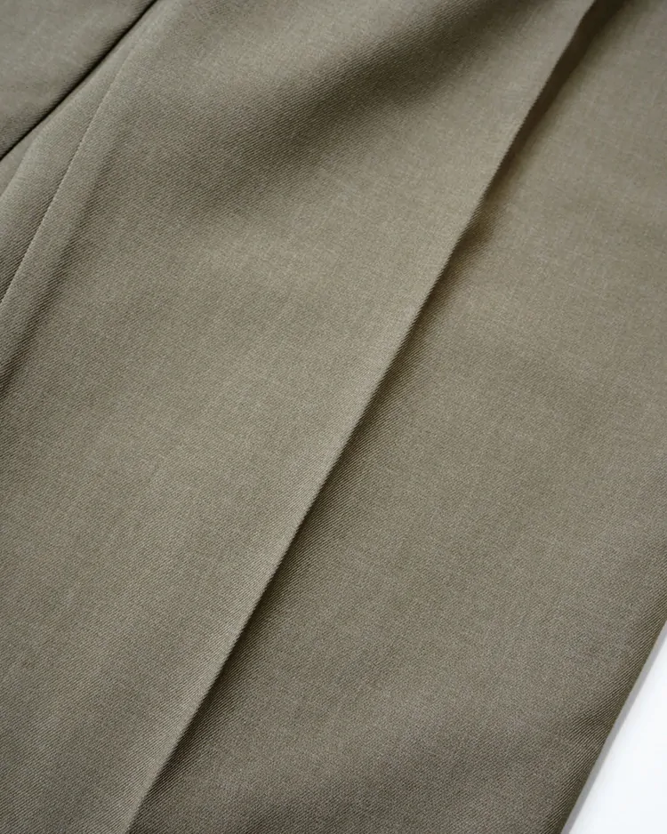 ヒップからワタリにかけてすっきりとしたフィット感で、裾に向かって真っすぐ落ちるストレートシルエット。股下はフルレングスの設計。センタークリースを入れることで、上品な雰囲気に仕上げました。