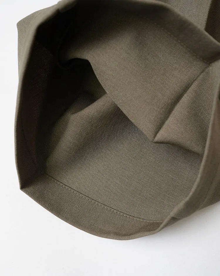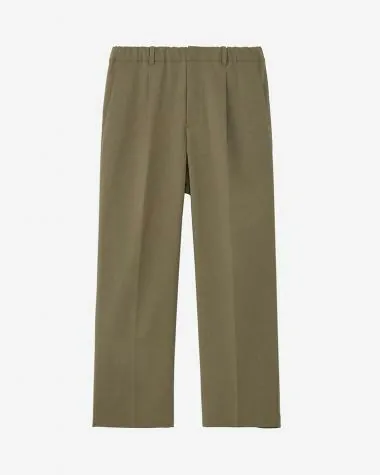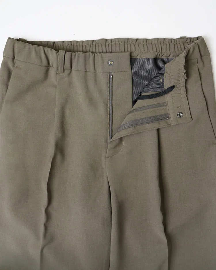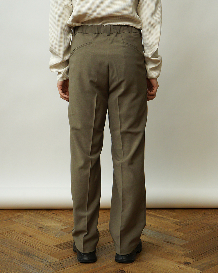 ウールのような風合いをもつポリエステル素材を使ったパンツ。ビジネスシーンからきれいめカジュアルまで、幅広いコーディネートに活躍します。