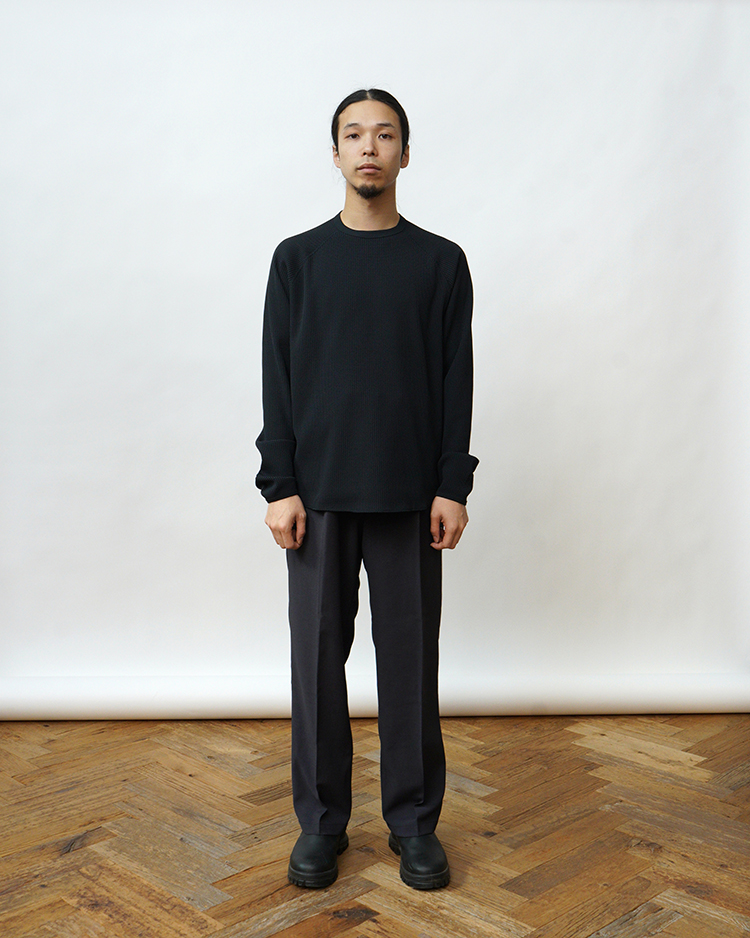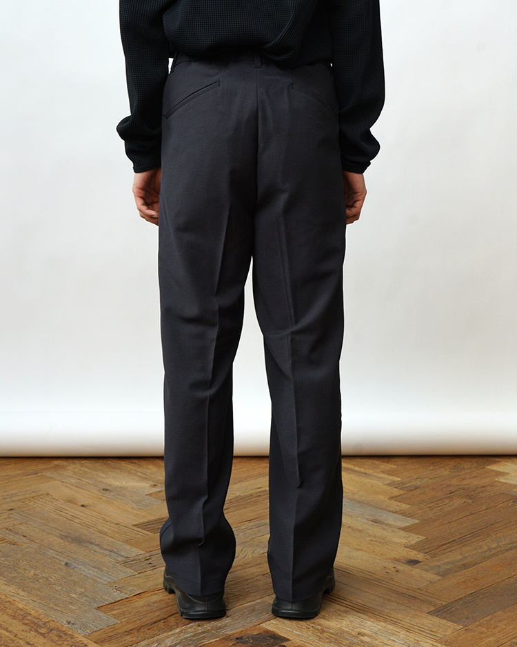 ヒップからワタリにかけてすっきりとしたフィット感で、裾に向かって真っすぐ落ちるストレートシルエット。股下はフルレングスの設計。センタークリースを入れることで、上品な雰囲気に仕上げました。