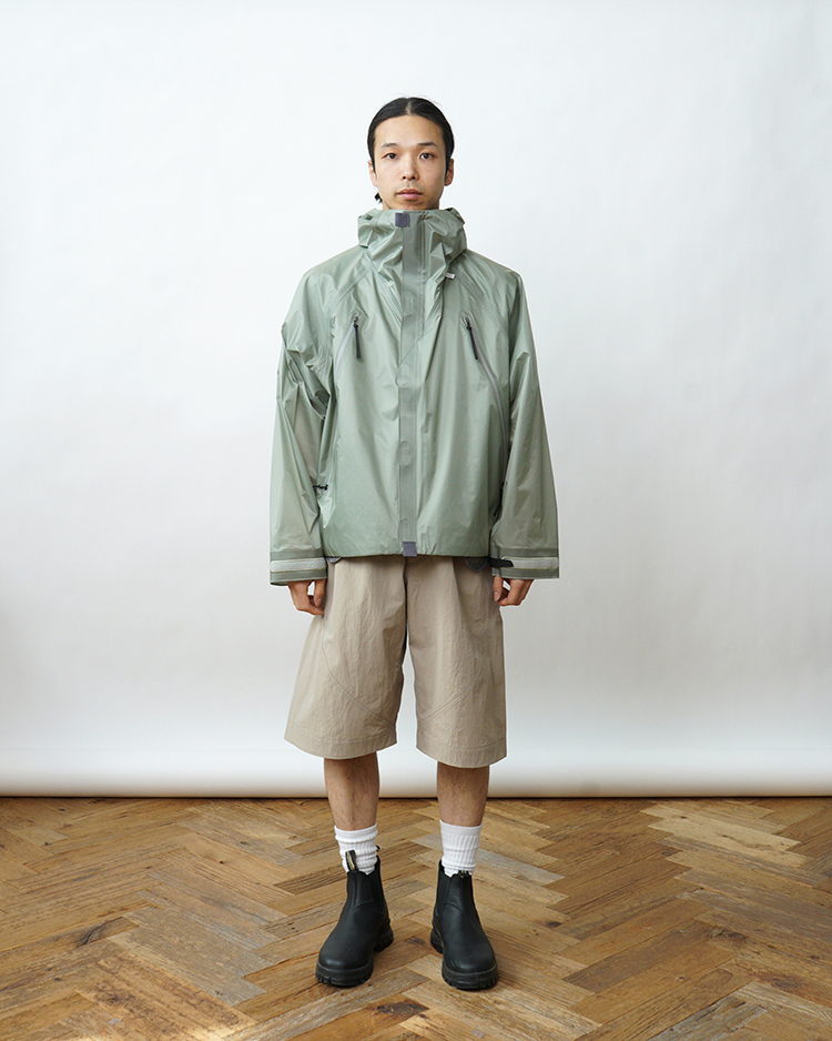 ワイドシルエットのレッグ部分は、スパイラル状の構造によって形作られており、全体にフッ素フリーのはっ水加工を施しています。