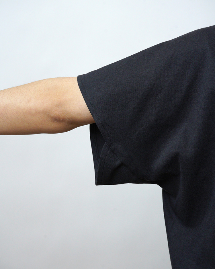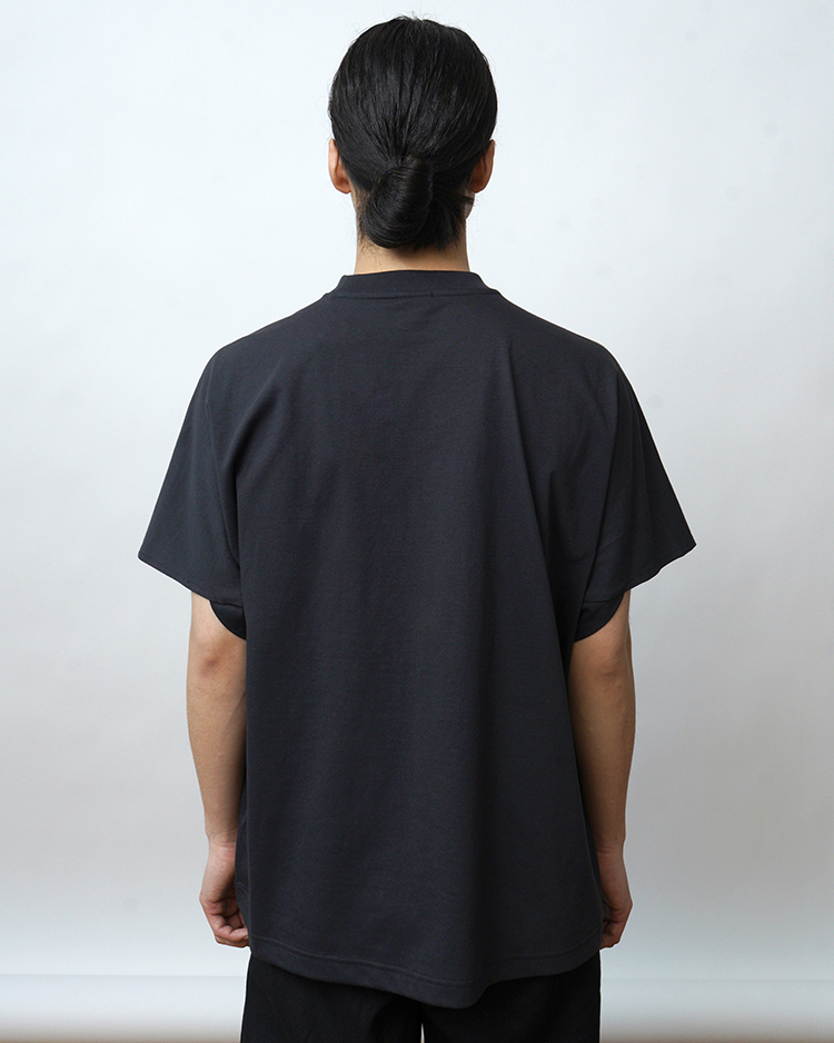 サイドに縫い目のない丸胴の生地を用い、さらに、袖もそのままボディに続いた生地を回転させるようにして構成することで、全体が1ピースのみでつくられたTシャツ。縫い目を極力少なくすることで、動きやすくユニークなフィットを生み出しています。