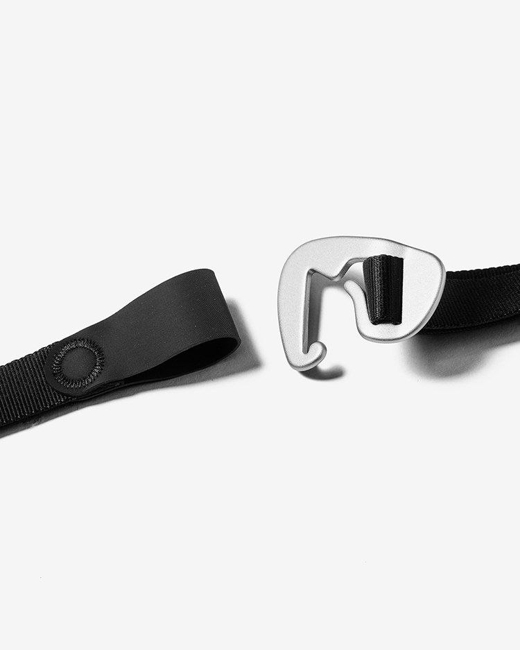 Goldwin 0によるオリジナルデザインのアルミニウム合金バックルを使用したテープベルト。