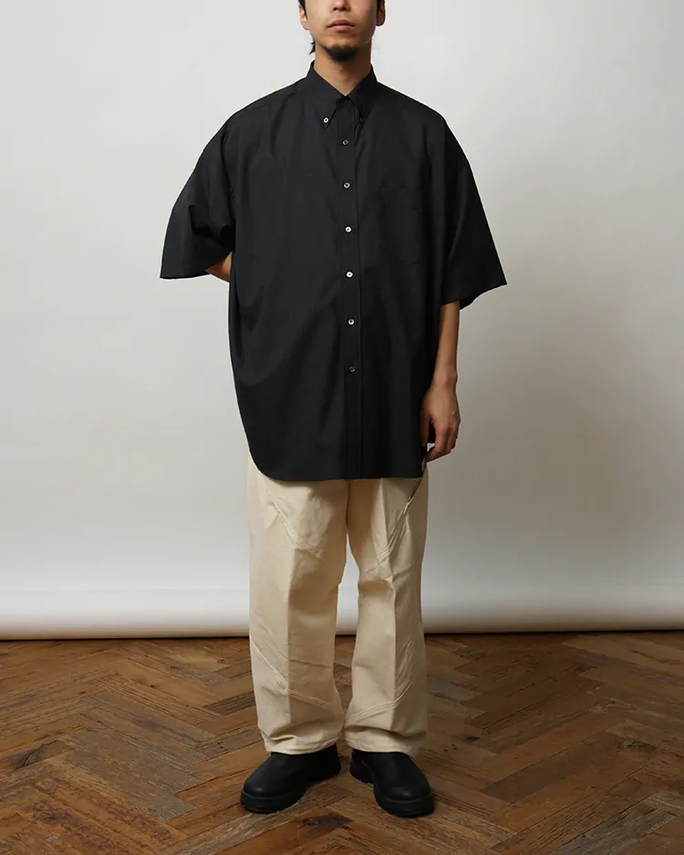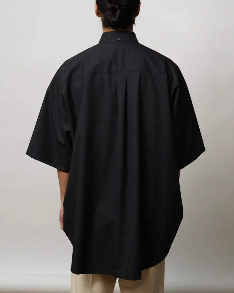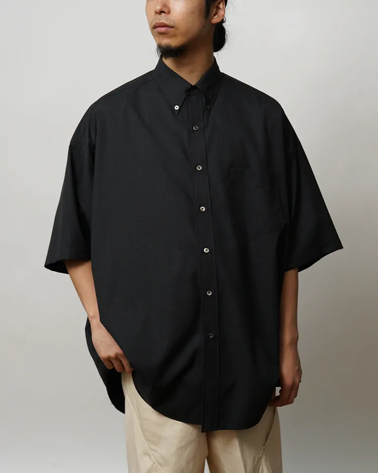 オーバーサイズシルエットが特徴の定番ボタンダウンショートスリーブシャツ。吟味されたSUPER160'sの上質な原料を用いたオリジナルのウールトロピカルを使用し、わたの段階で染色するトップ染めにより奥行きのある色合いと滑らかなタッチを実現。表面には撥水加工を施し、雨や汚れに強い機能性も兼ね備える。肩の傾斜や低めに設定されたヨーク、広めのアームホールなど、細部にまでこだわった独自のバランスで構成。