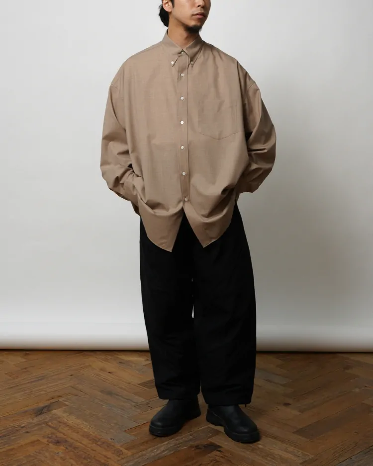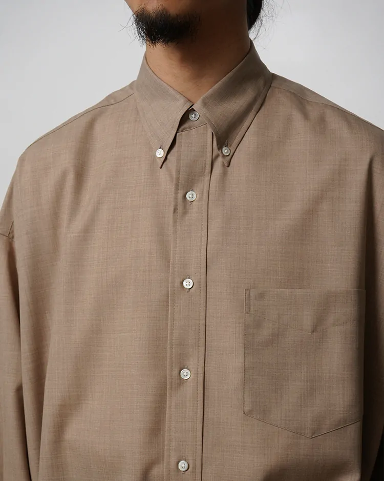 オーバーサイズシルエットが特徴の定番ボタンダウンのロングスリーブシャツ。吟味されたSUPER160'sの上質な原料を用いたオリジナルのウールトロピカルを使用し、わたの段階で染色するトップ染めにより奥行きのある色合いと滑らかなタッチを実現。表面には撥水加工を施し、雨や汚れに強い機能性も兼ね備える。肩の傾斜や低めに設定されたヨーク、広めのアームホールなど、細部にまでこだわった独自のバランスで構成。