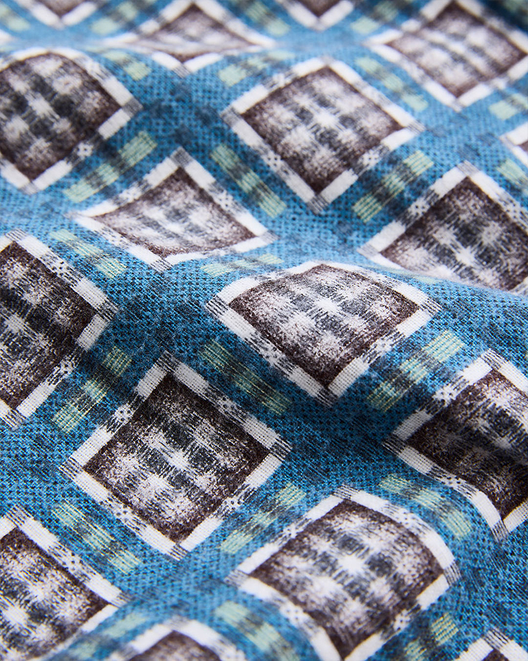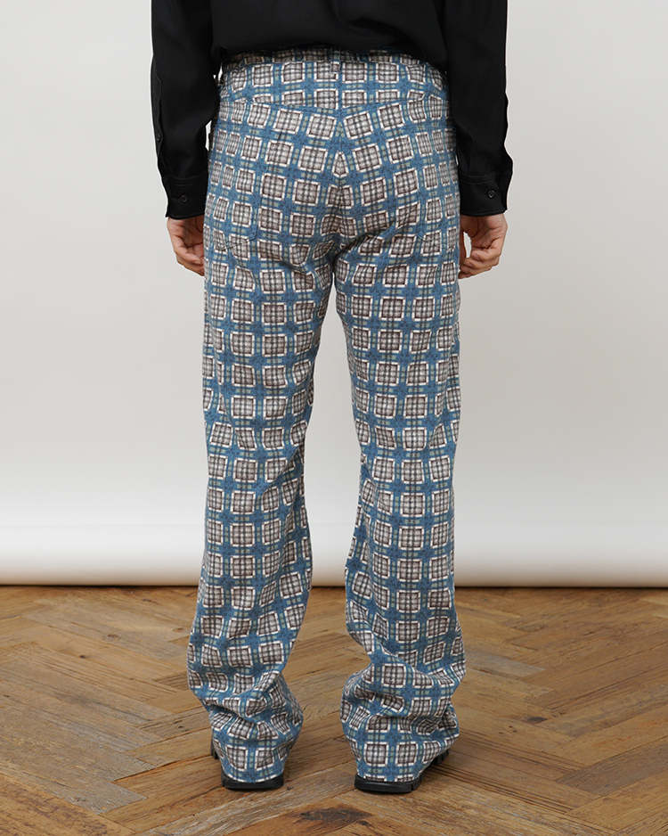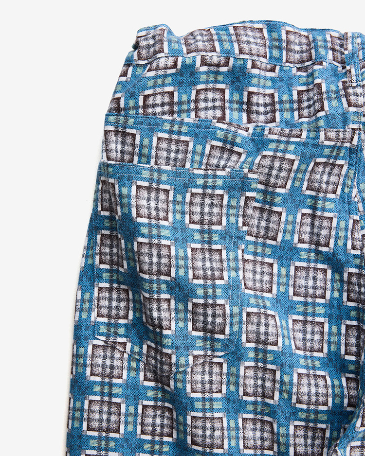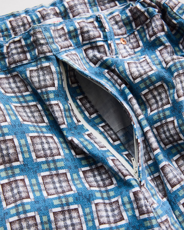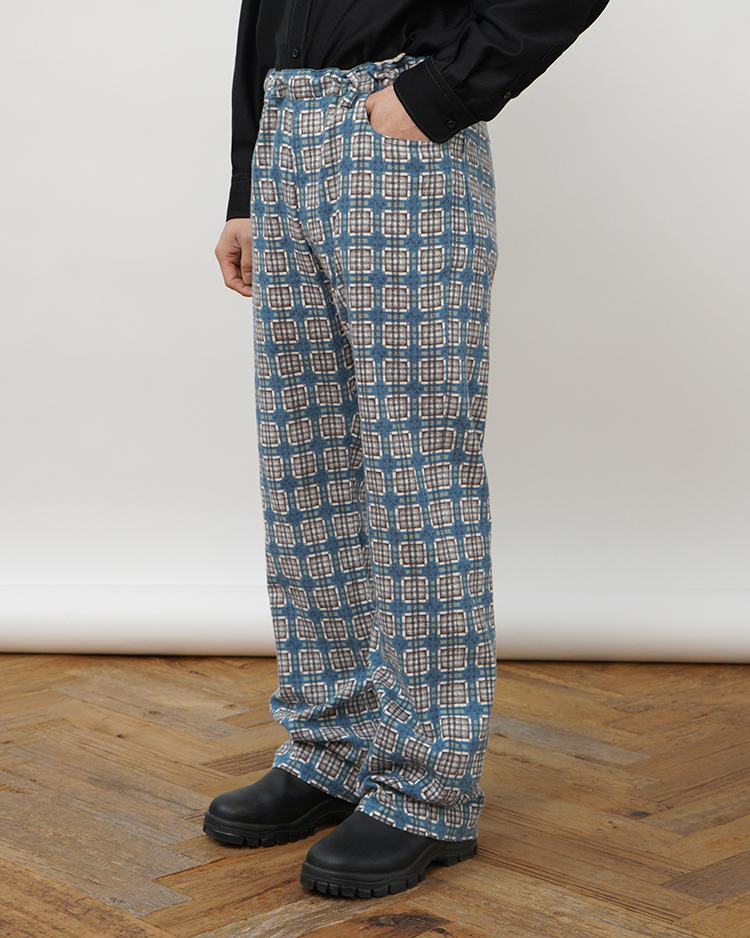 1940〜50年代のプリントネル素材をリファレンスとしたビスポーク生地を使用したイージートラウザー。当時のプリントは主に手作業によって施されており、生地表面を抜けて裏面にまでインクが付着する「裏抜け」が特徴。繊細なチェック柄も崩れないように5版のハンドスクリーンプリントで丁寧に表現し、後起毛加工により柄の深みと独特の風合いを引き出しています。ネルシャツの型やムードから着想し、1970年代のセミフレアシルエットを取り入れ、ゆったりとした穿き心地と現代的快適さを両立させているイージートラウザーです。