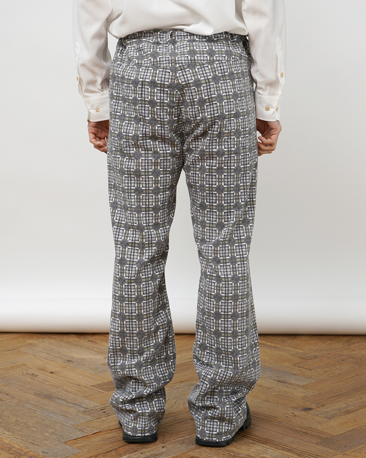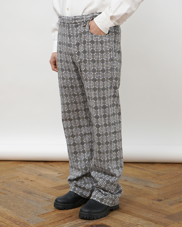 1940〜50年代のプリントネル素材をリファレンスとしたビスポーク生地を使用したイージートラウザー。当時のプリントは主に手作業によって施されており、生地表面を抜けて裏面にまでインクが付着する「裏抜け」が特徴。繊細なチェック柄も崩れないように5版のハンドスクリーンプリントで丁寧に表現し、後起毛加工により柄の深みと独特の風合いを引き出しています。ネルシャツの型やムードから着想し、1970年代のセミフレアシルエットを取り入れ、ゆったりとした穿き心地と現代的快適さを両立させているイージートラウザーです。